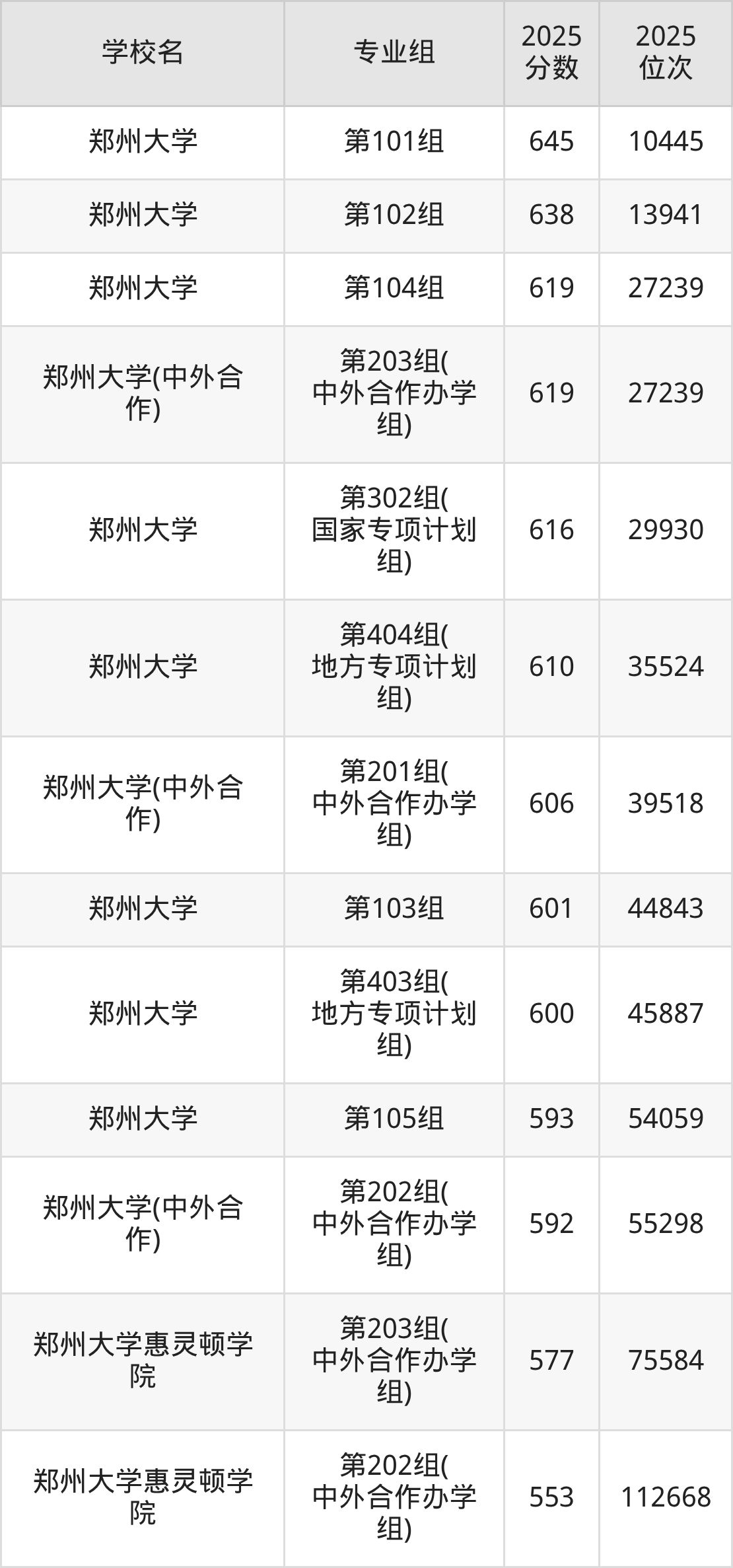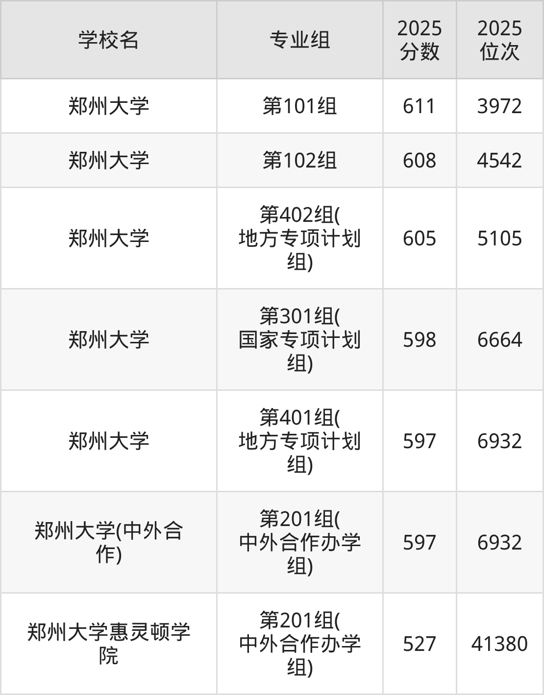 其中,分数线排名第一的211大学是郑州大学第101组,除此之外,收分较高的院校还有:郑州大学第102组608分、郑州大学第402组(地方专项计划组)605分、郑州大学第301组(国家专项计划组)598分、郑州大学第401组(地方专项计划组)597分。