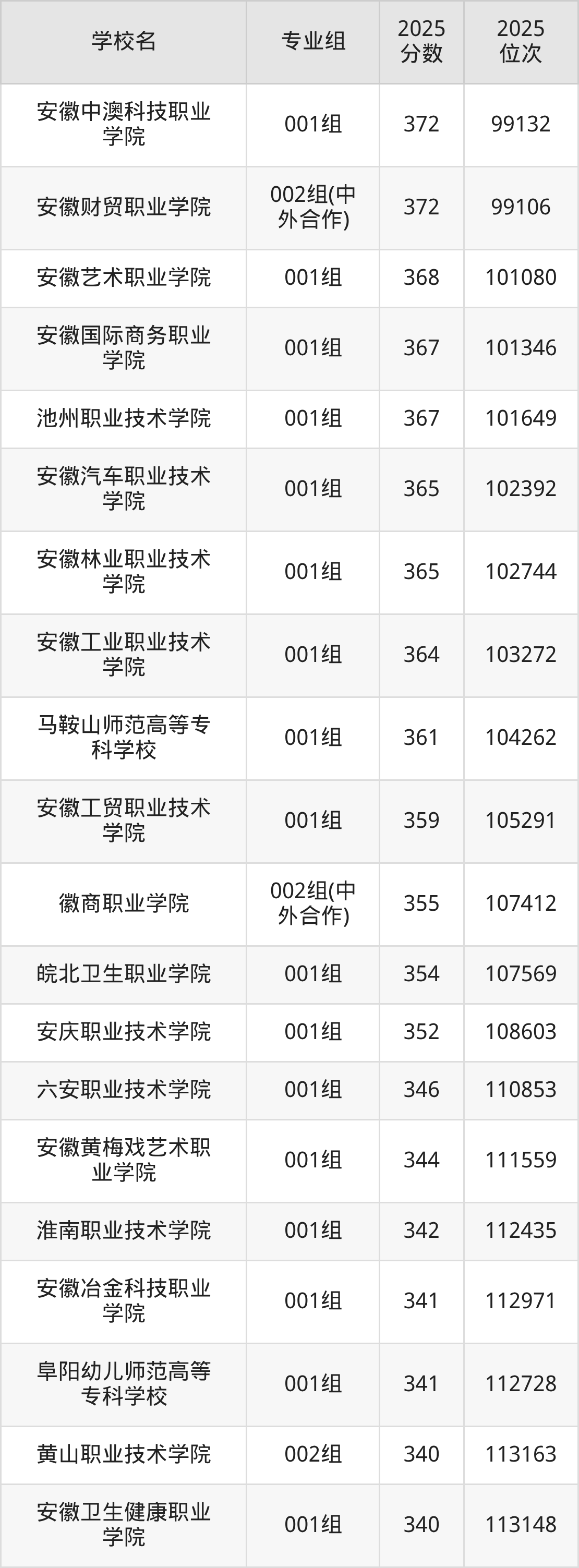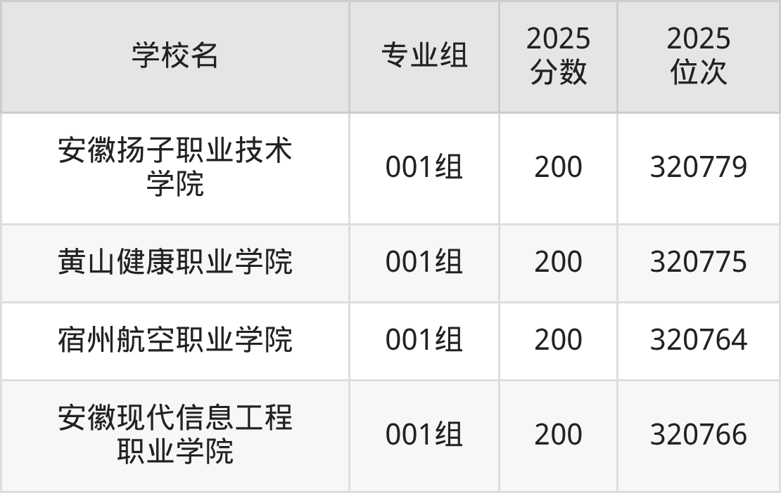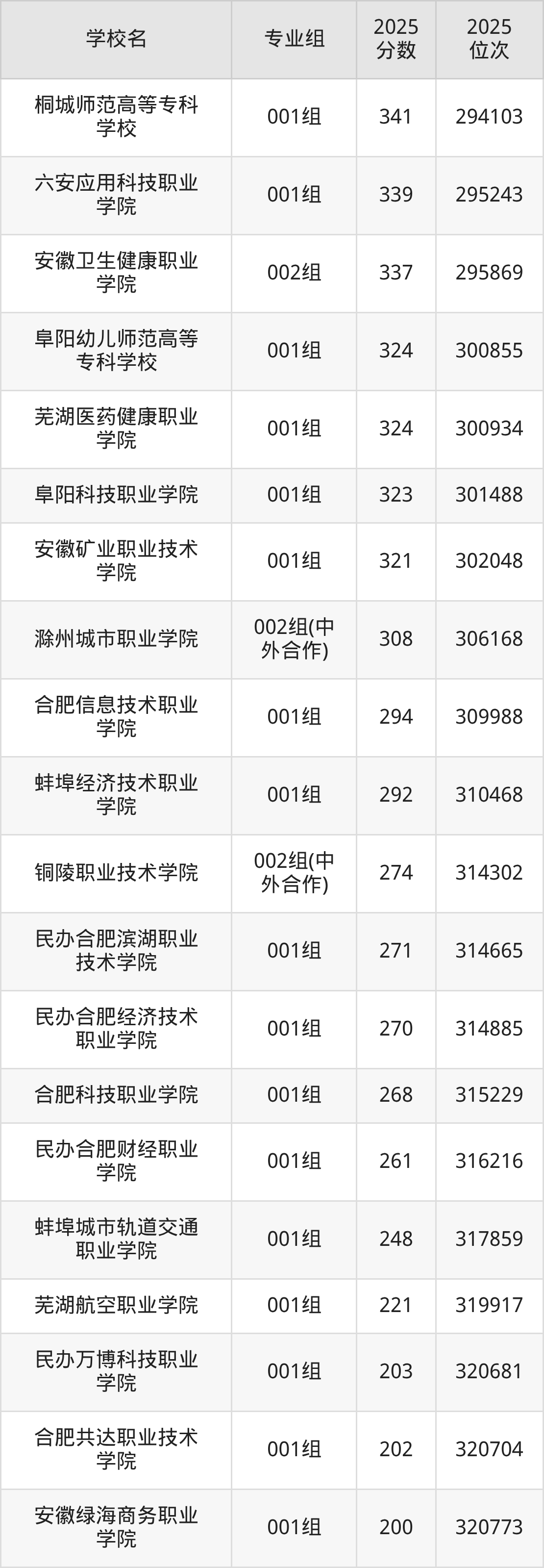 分数线排名最后的专科院校是安徽绿海商务职业学院001组(200分)、安徽扬子职业技术学院001组(200分)等,除此之外,收分较低的院校还有:合肥共达职业技术学院001组202分、民办万博科技职业学院001组203分、芜湖航空职业学院001组221分、蚌埠城市轨道交通职业学院001组248分。