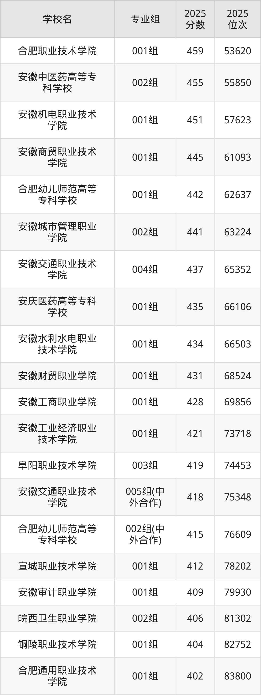 其中,分数线排名第一的专科院校是合肥职业技术学院001组,除此之外,收分较高的院校还有:安徽中医药高等专科学校002组455分、安徽机电职业技术学院001组451分、安徽商贸职业技术学院001组445分、合肥幼儿师范高等专科学校001组442分。