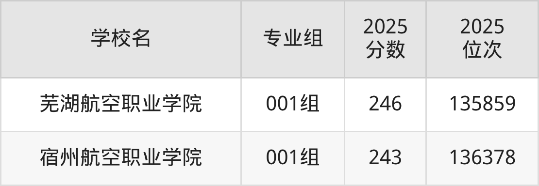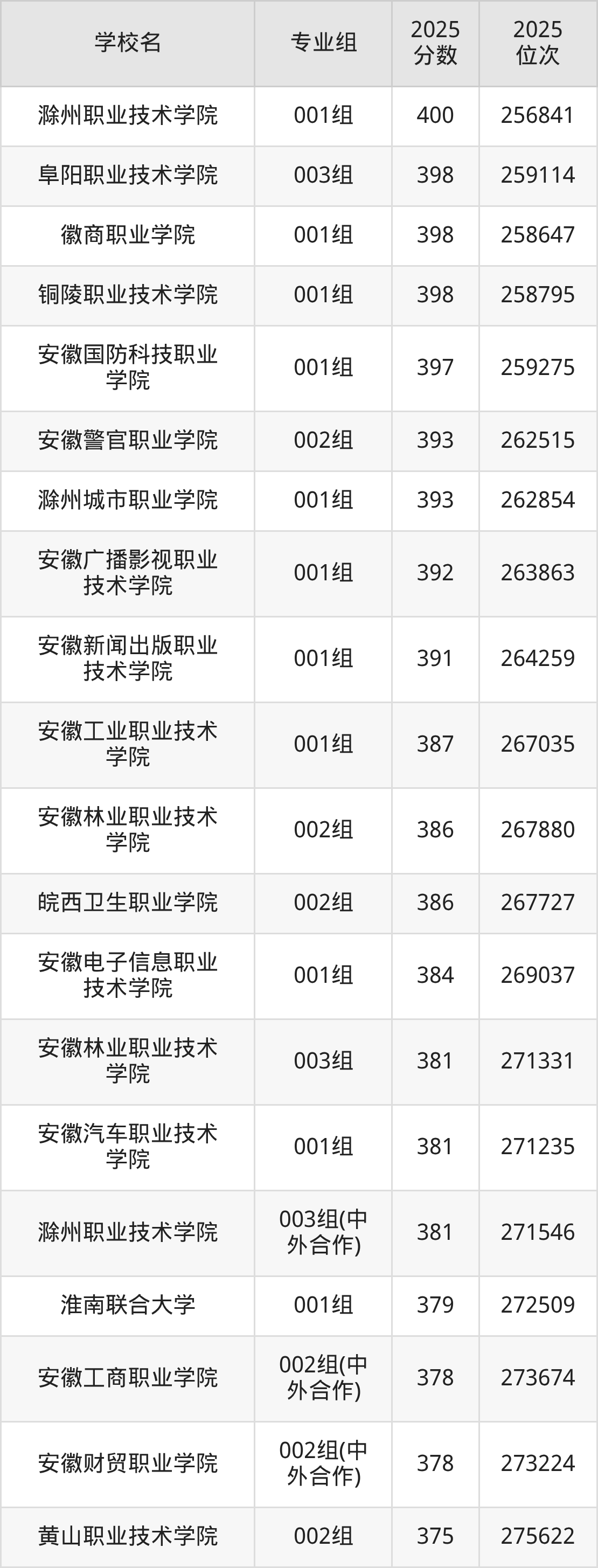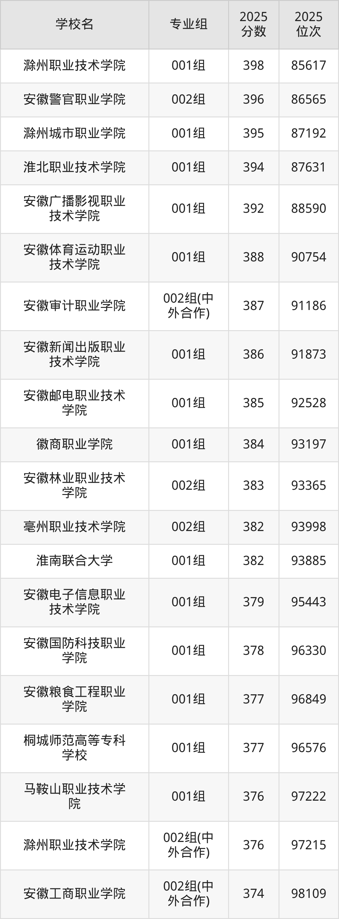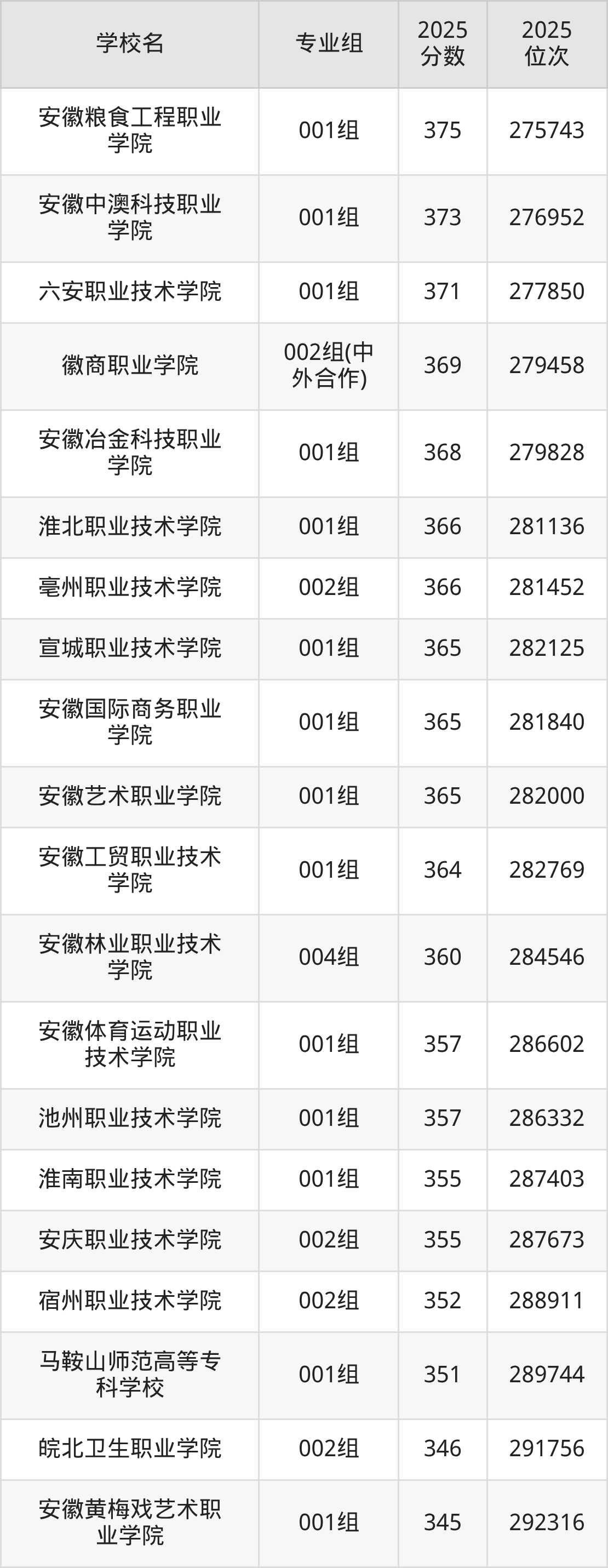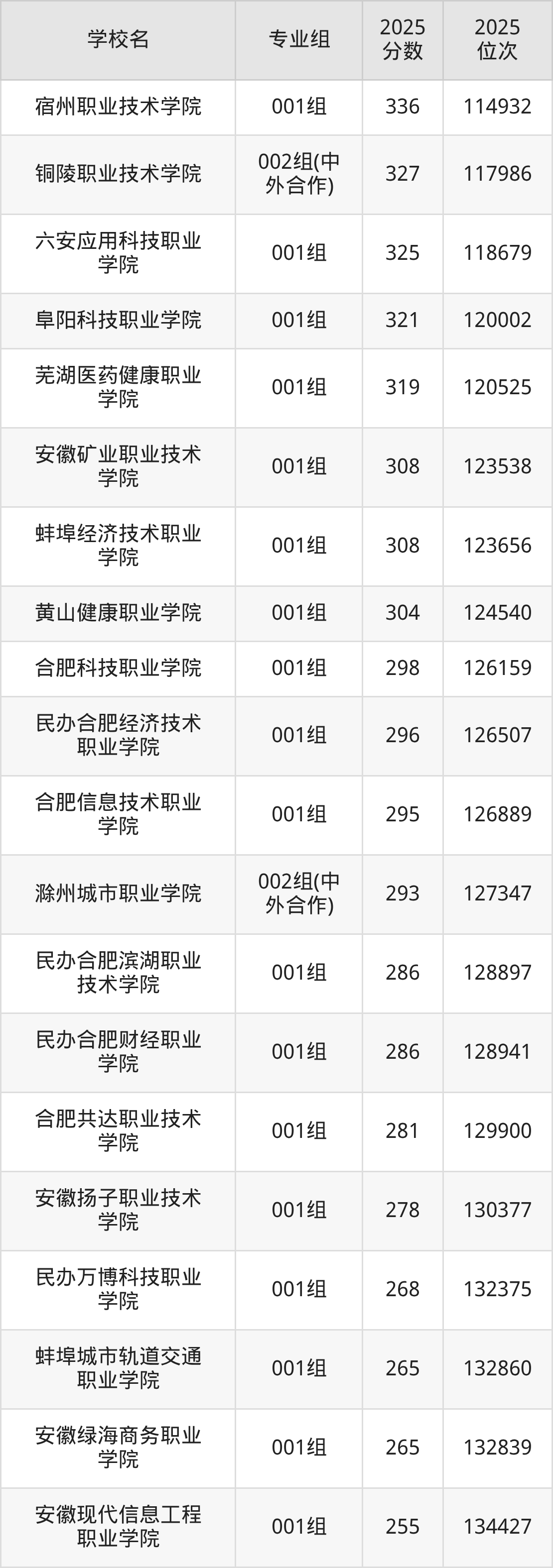 分数线排名最后的专科院校是宿州航空职业学院001组(243分),除此之外,收分较低的院校还有:芜湖航空职业学院001组246分、安徽现代信息工程职业学院001组255分、安徽绿海商务职业学院001组265分、蚌埠城市轨道交通职业学院001组265分。