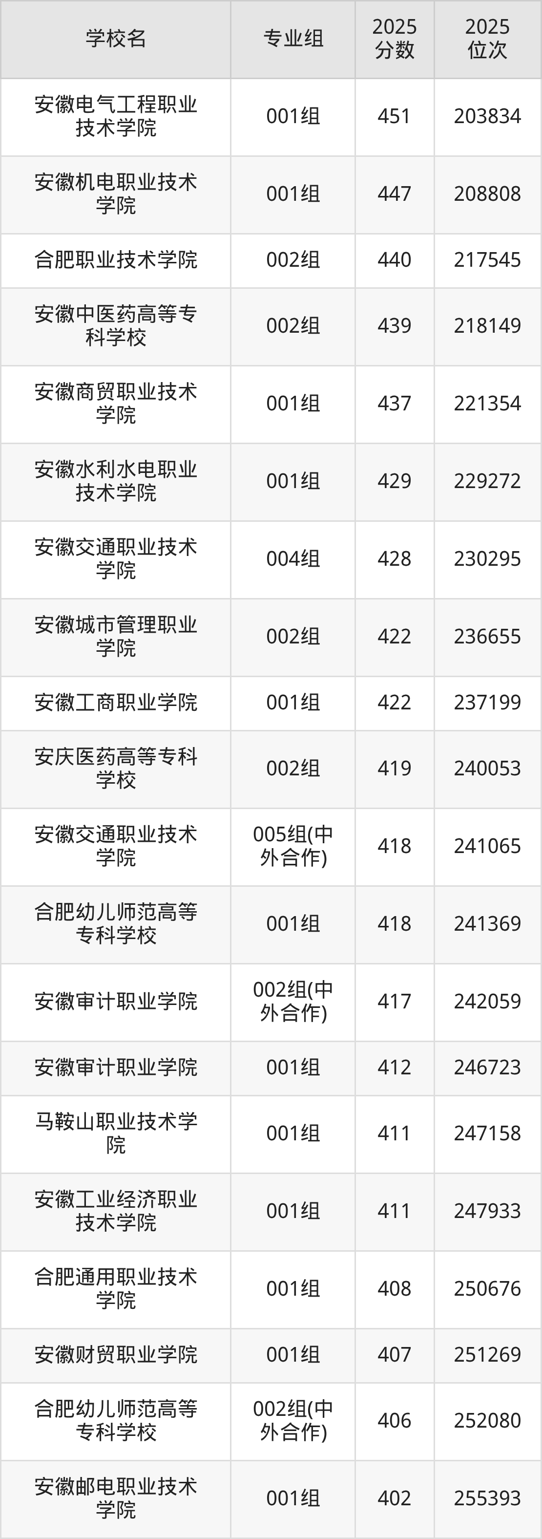 其中,分数线排名第一的专科院校是安徽电气工程职业技术学院001组,除此之外,收分较高的院校还有:安徽机电职业技术学院001组447分、合肥职业技术学院002组440分、安徽中医药高等专科学校002组439分、安徽商贸职业技术学院001组437分。