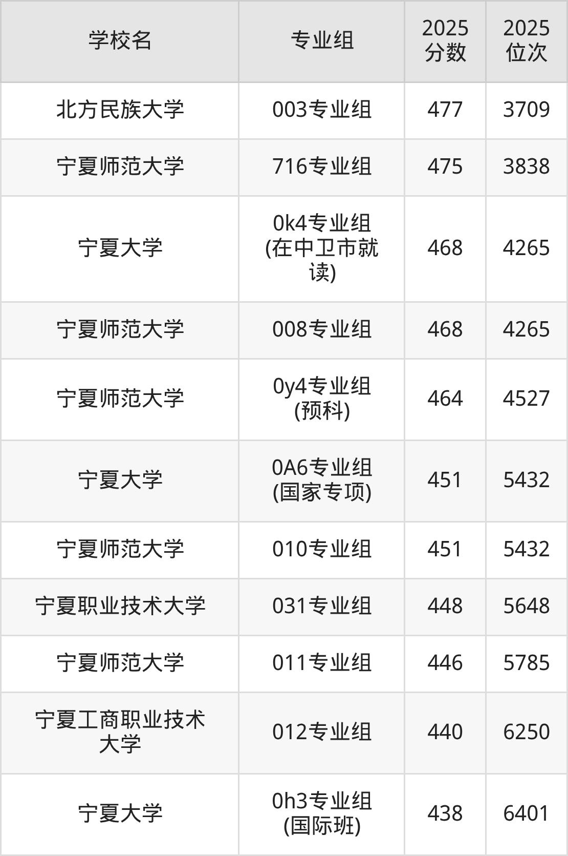 分数线排名最后的公办本科大学是宁夏大学0h3专业组(国际班)(438分),除此之外,收分较低的院校还有:宁夏工商职业技术大学012专业组440分、宁夏师范大学011专业组446分、宁夏职业技术大学031专业组448分、宁夏大学0A6专业组(国家专项)451分。
