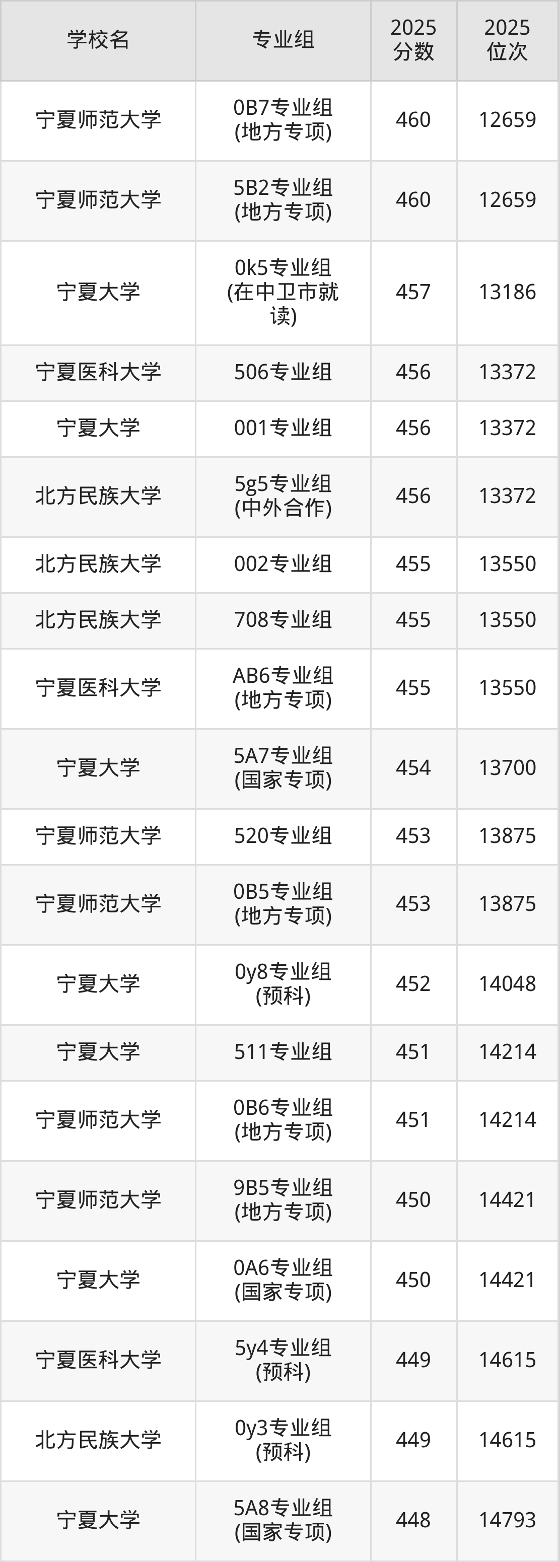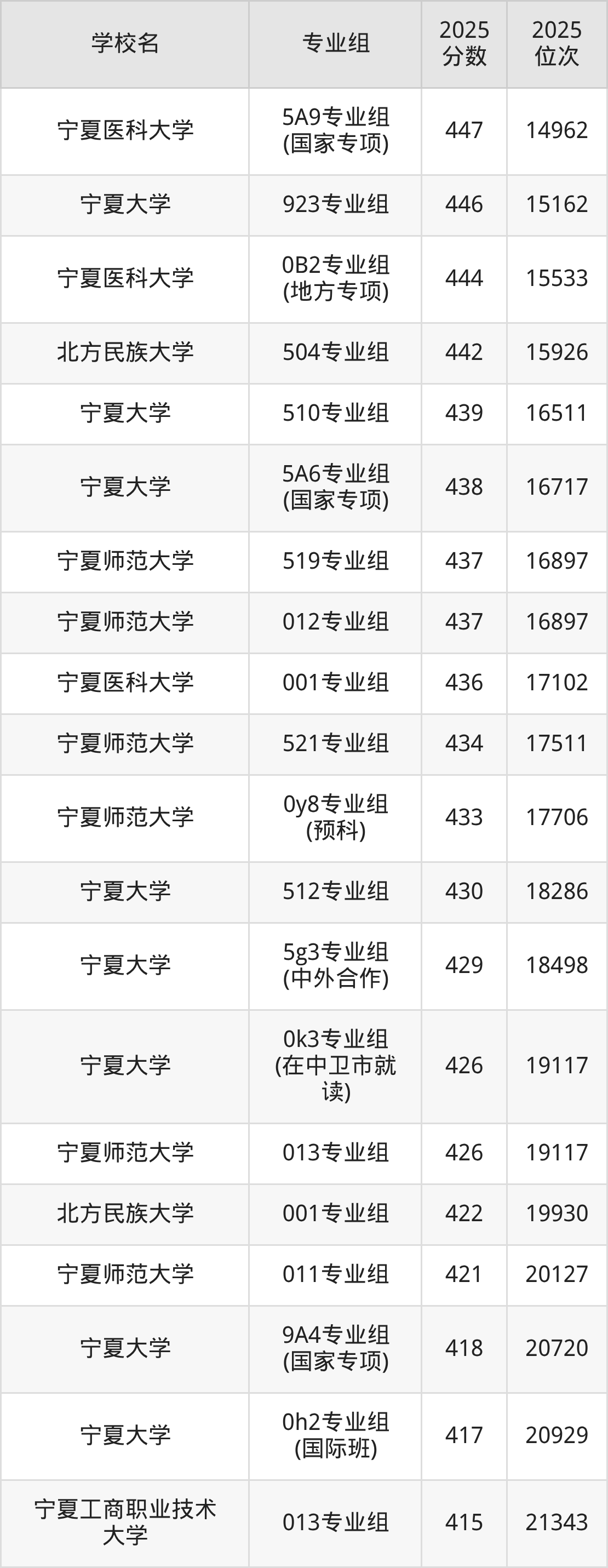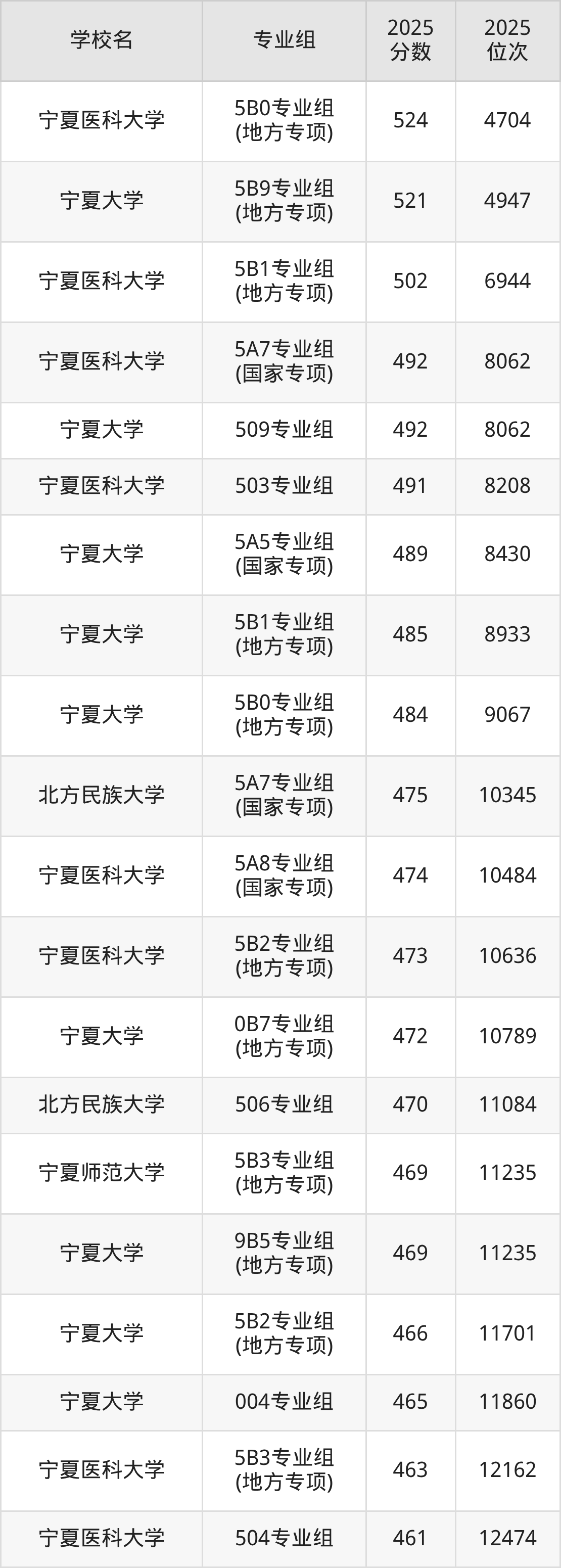 其中,分数线排名第一的公办本科大学是宁夏医科大学5B0专业组(地方专项),除此之外,收分较高的院校还有:宁夏大学5B9专业组(地方专项)521分、宁夏医科大学5B1专业组(地方专项)502分、宁夏医科大学5A7专业组(国家专项)492分、宁夏大学509专业组492分。