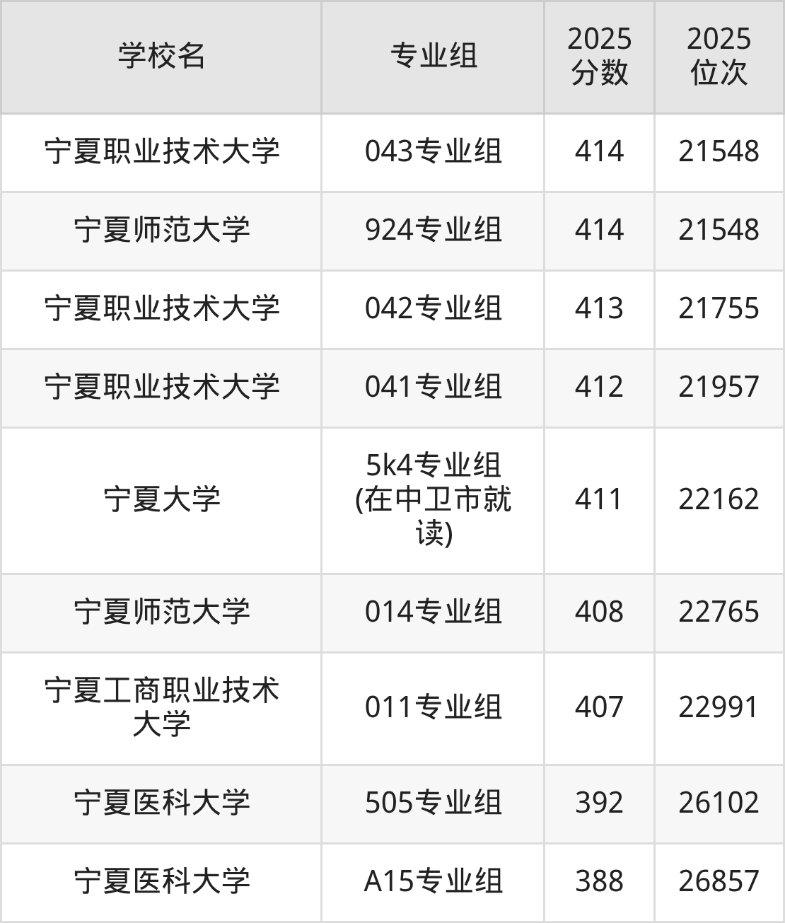 分数线排名最后的公办本科大学是宁夏医科大学A15专业组(388分),除此之外,收分较低的院校还有:宁夏医科大学505专业组392分、宁夏工商职业技术大学011专业组407分、宁夏师范大学014专业组408分、宁夏大学5k4专业组(在中卫市就读)411分。
