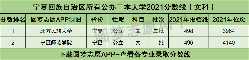 根据下图可知,宁夏回族自治区内的公办二本大学2021年在宁夏高考文科的最低分数线为496分,对应的大学为宁夏师范学院。而宁夏回族自治区2021年高考文科二本线为430分,这也就意味着如果你想留在宁夏回族自治区内读公立二本大学,那么高考成绩至少要超过二本线66分才行!