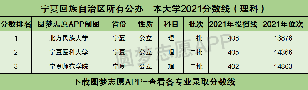 根据宁夏回族自治区教育考试院公布的2021年高考在宁夏回族自治区理科本科二批次招生的所有数据,小编为大家总结了宁夏回族自治区所有公立大学名单,一共有3所。其中有不少学校是既在宁夏回族自治区本科一批招生也在宁夏本科二批招生的大学!