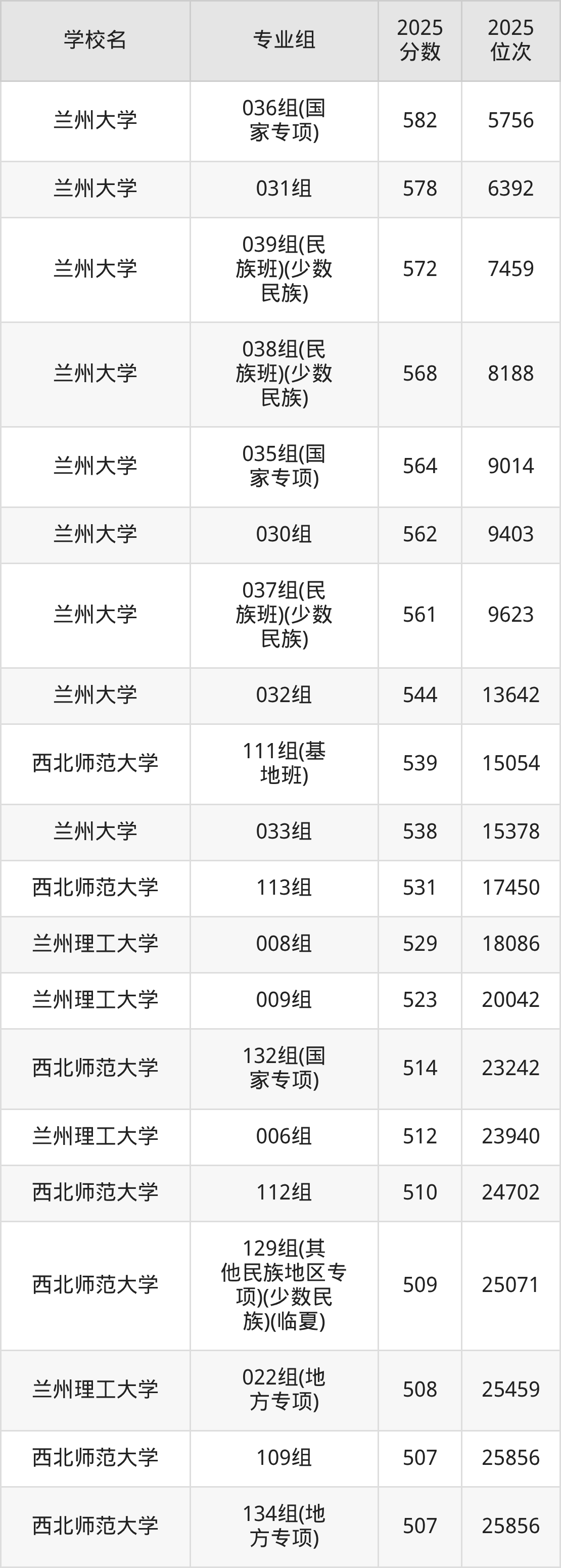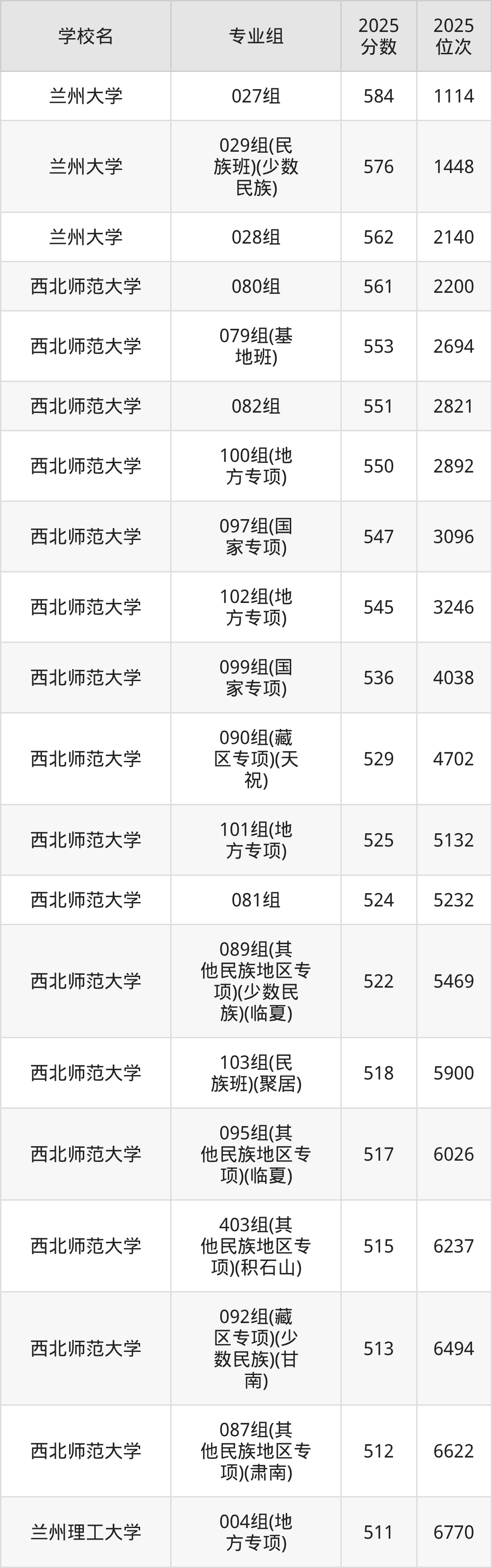 其中,分数线排名第一的一本大学是兰州大学027组,除此之外,收分较高的院校还有:兰州大学029组(民族班)(少数民族)576分、兰州大学028组562分、西北师范大学080组561分、西北师范大学079组(基地班)553分。