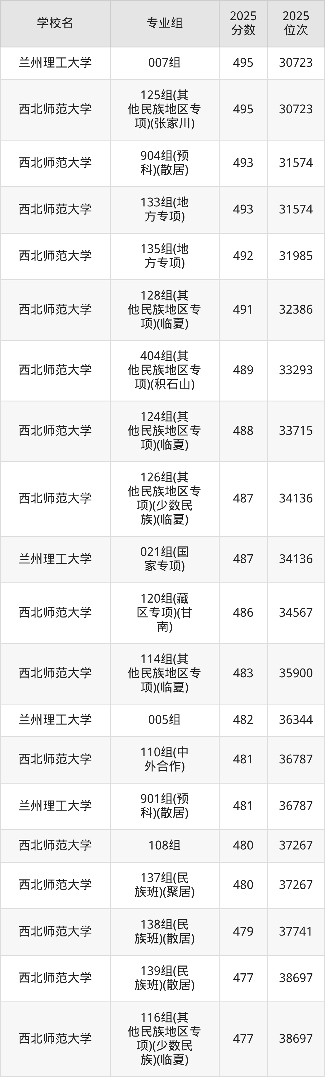 分数线排名最后的一本大学是西北师范大学139组(民族班)(散居)(477分)、西北师范大学116组(其他民族地区专项)(少数民族)(临夏)(477分),除此之外,收分较低的院校还有:西北师范大学138组(民族班)(散居)479分、西北师范大学137组(民族班)(聚居)480分、西北师范大学108组480分、兰州理工大学901组(预科)(散居)481分。