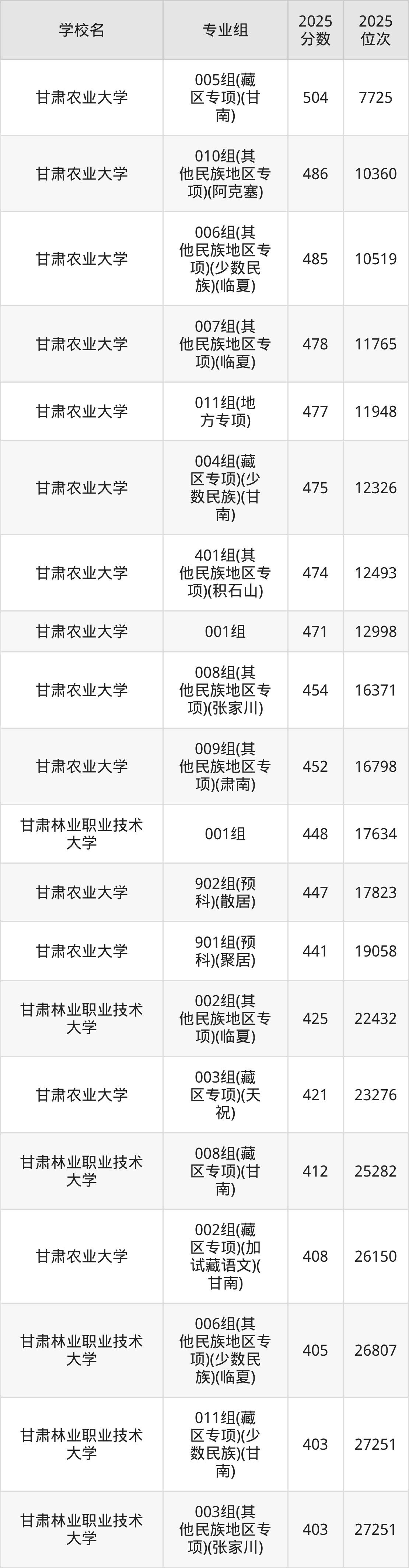其中,分数线排名第一的农林类大学是甘肃农业大学005组(藏区专项)(甘南),除此之外,收分较高的院校还有:甘肃农业大学010组(其他民族地区专项)(阿克塞)486分、甘肃农业大学006组(其他民族地区专项)(少数民族)(临夏)485分、甘肃农业大学007组(其他民族地区专项)(临夏)478分、甘肃农业大学011组(地方专项)477分。