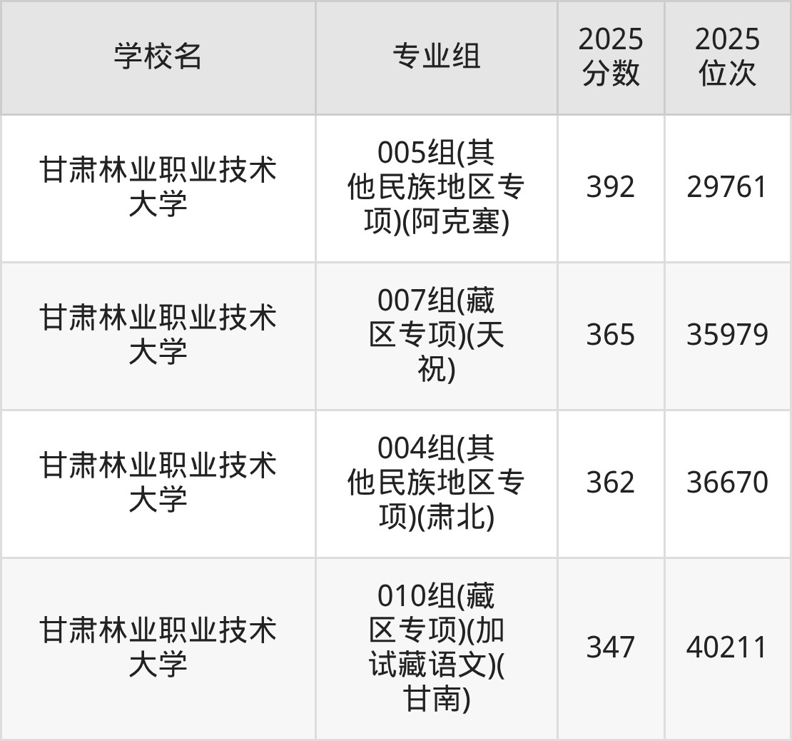 分数线排名最后的农林类大学是甘肃林业职业技术大学010组(藏区专项)(加试藏语文)(甘南)(347分),除此之外,收分较低的院校还有:甘肃林业职业技术大学004组(其他民族地区专项)(肃北)362分、甘肃林业职业技术大学007组(藏区专项)(天祝)365分、甘肃林业职业技术大学005组(其他民族地区专项)(阿克塞)392分、甘肃林业职业技术大学003组(其他民族地区专项)(张家川)403分。