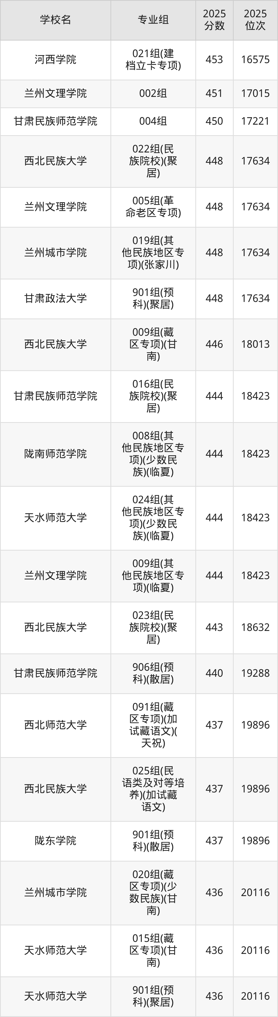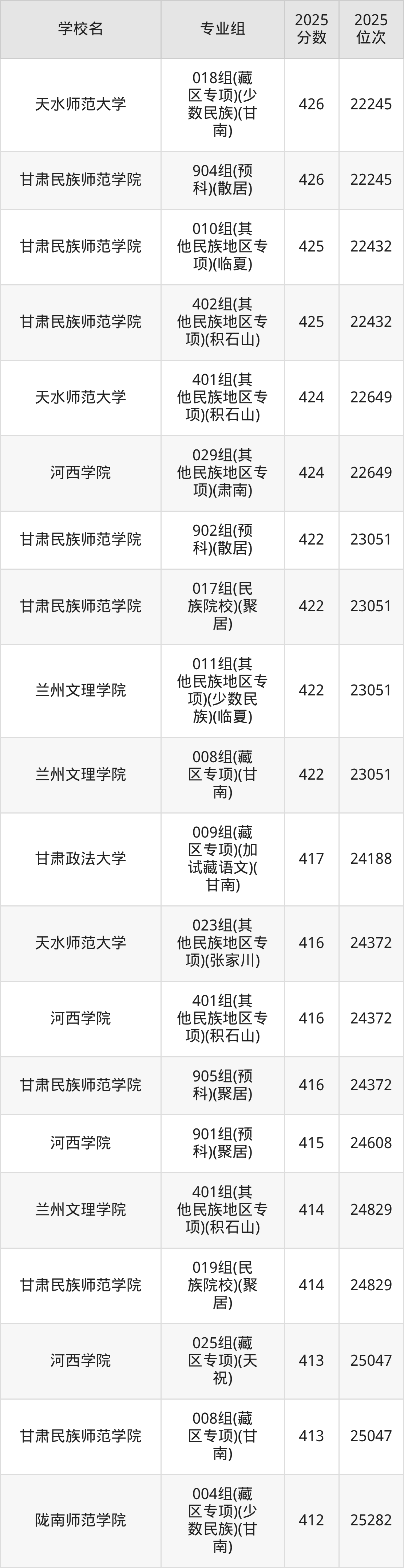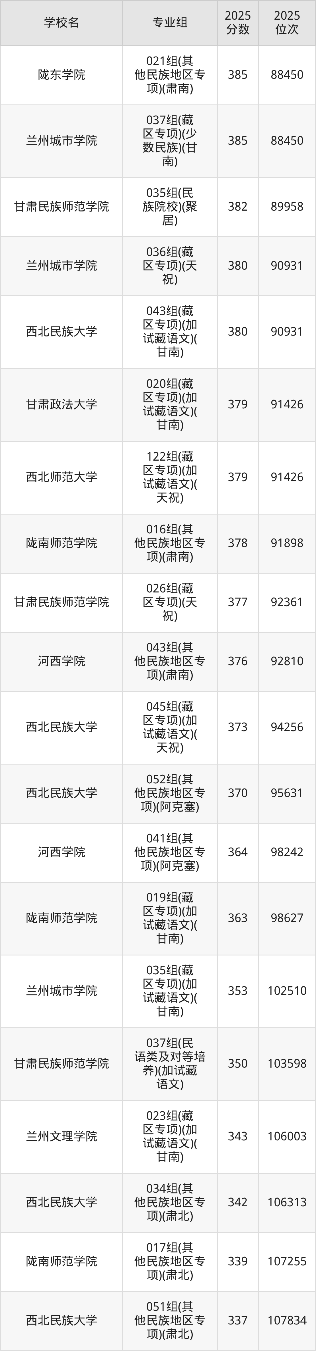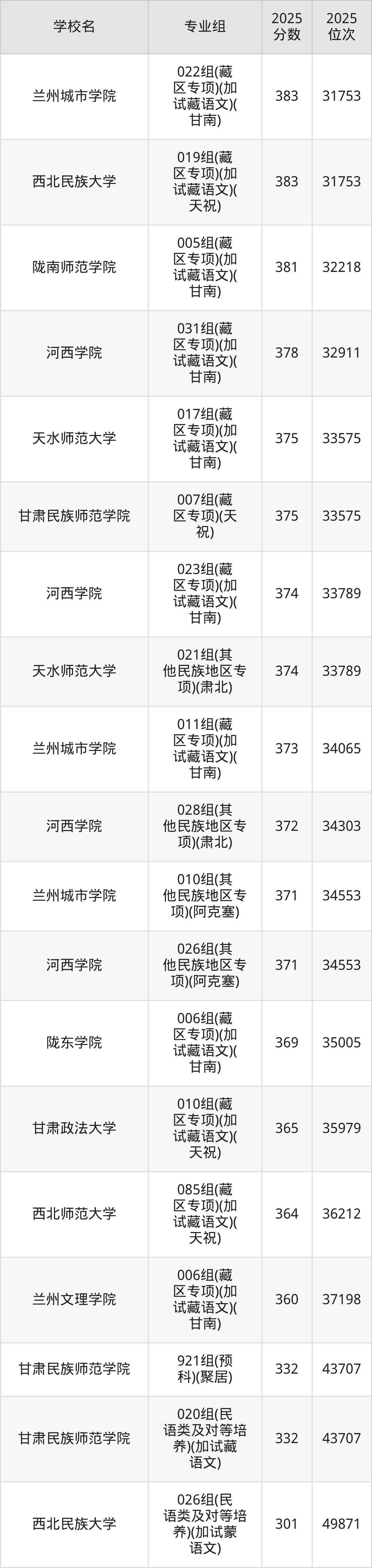 分数线排名最后的文科大学是西北民族大学026组(民语类及对等培养)(加试蒙语文)(301分),除此之外,收分较低的院校还有:甘肃民族师范学院020组(民语类及对等培养)(加试藏语文)332分、甘肃民族师范学院921组(预科)(聚居)332分、兰州文理学院006组(藏区专项)(加试藏语文)(甘南)360分、西北师范大学085组(藏区专项)(加试藏语文)(天祝)364分。