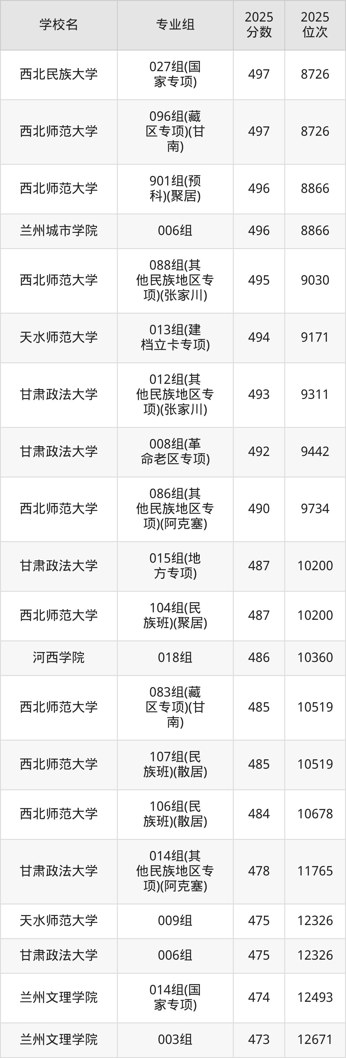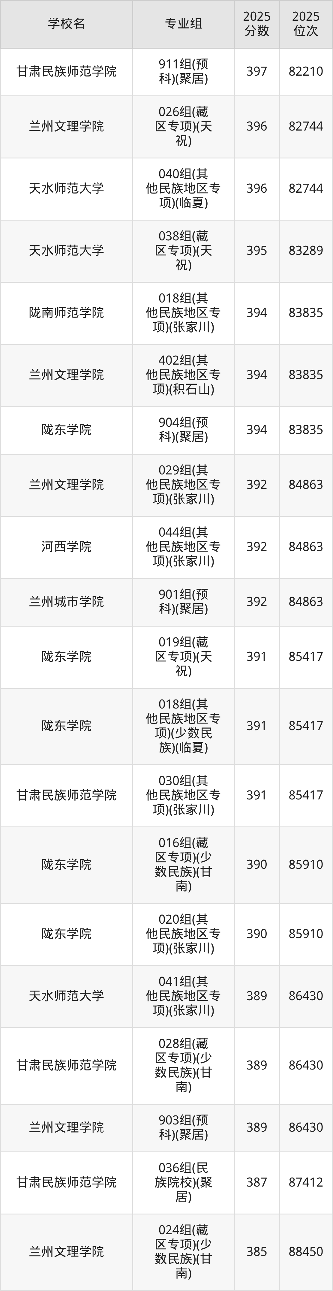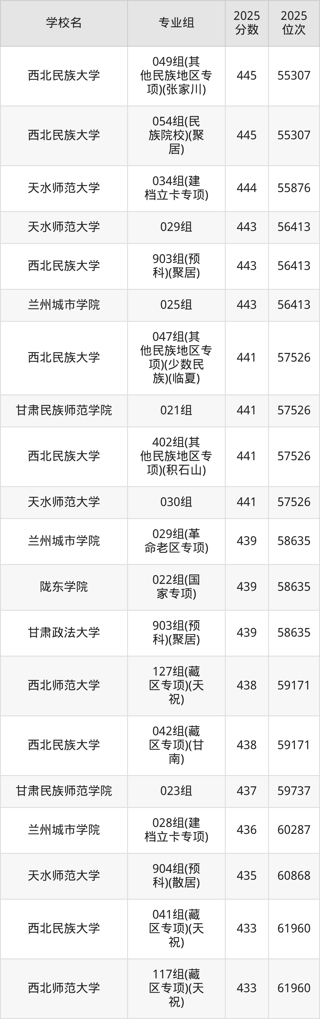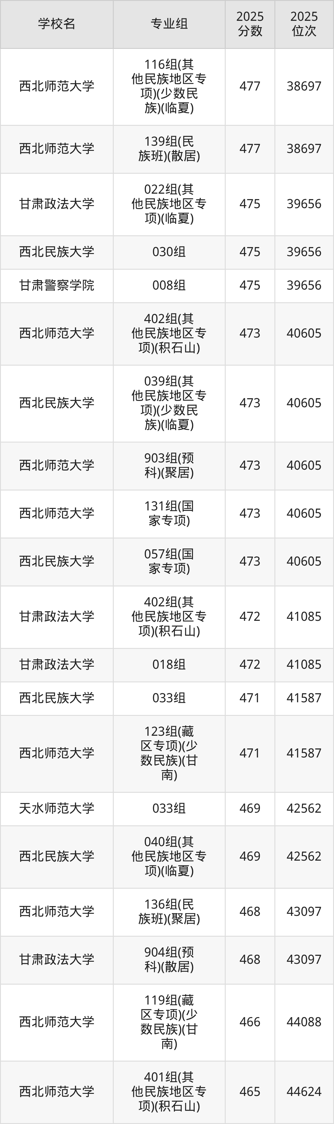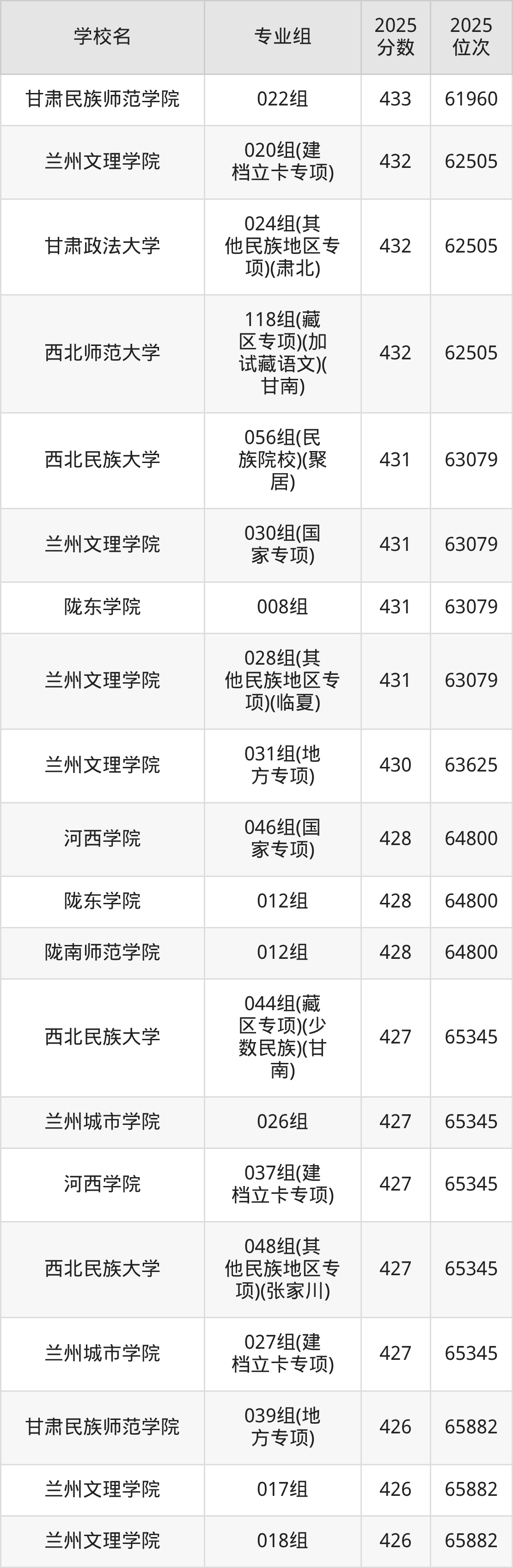分数线排名最后的文科大学是西北民族大学026组(民语类及对等培养)(加试蒙语文)(301分),除此之外,收分较低的院校还有:甘肃民族师范学院020组(民语类及对等培养)(加试藏语文)332分、甘肃民族师范学院921组(预科)(聚居)332分、兰州文理学院006组(藏区专项)(加试藏语文)(甘南)360分、西北师范大学085组(藏区专项)(加试藏语文)(天祝)364分。
