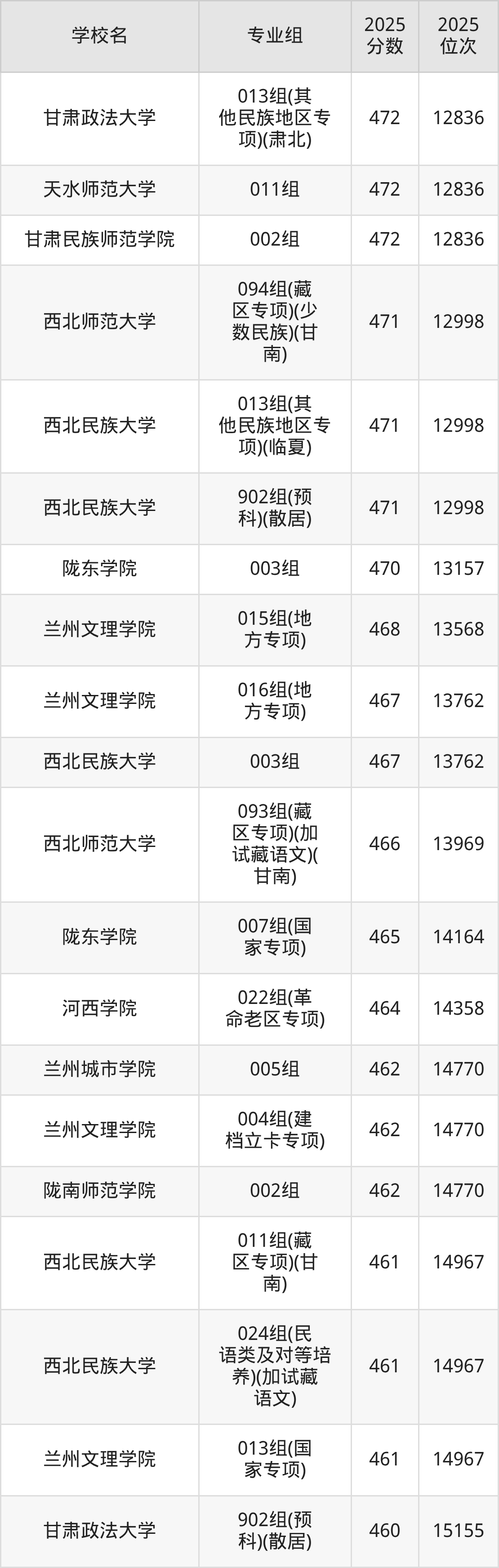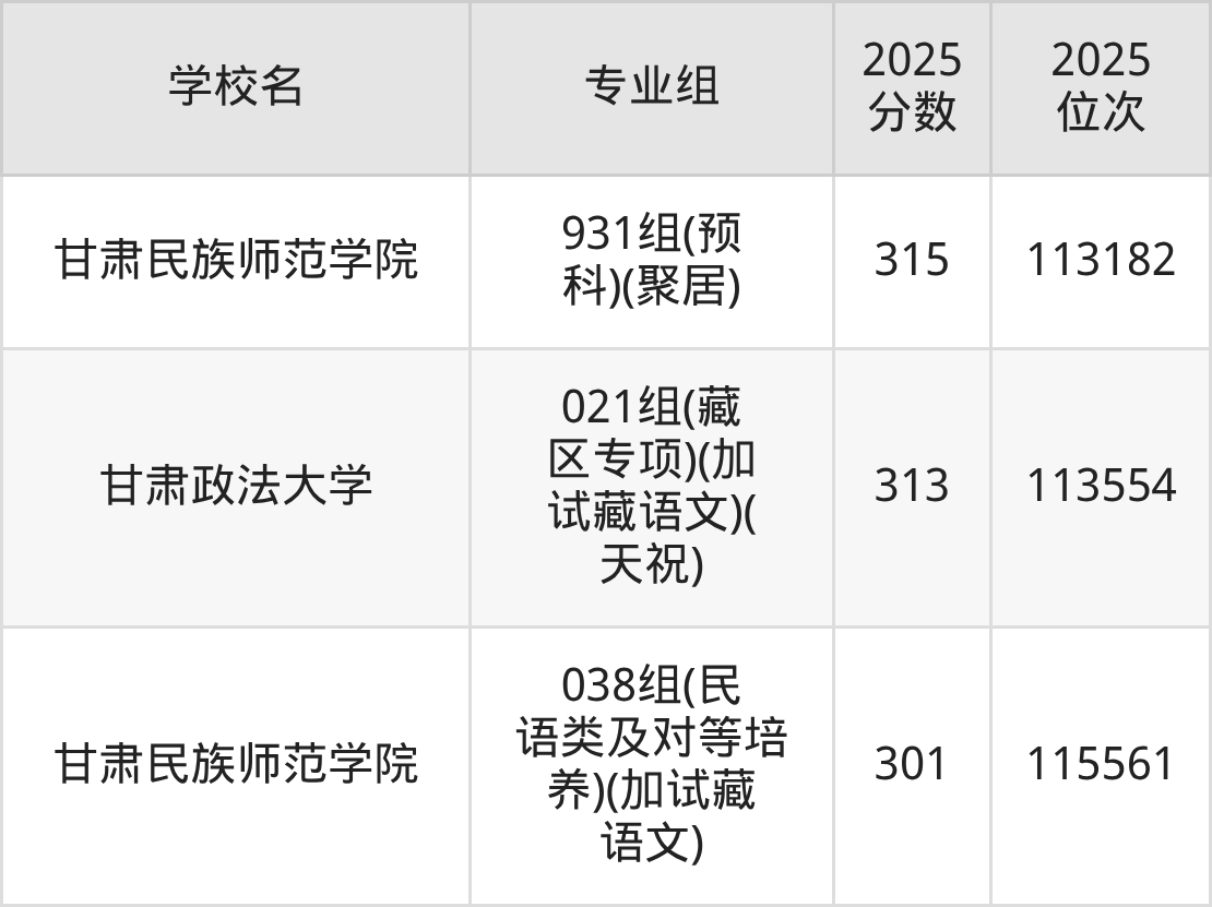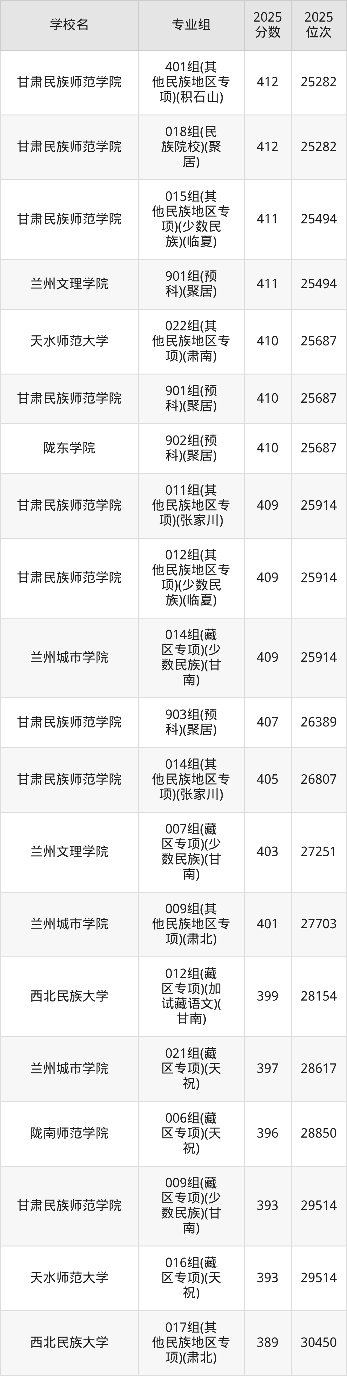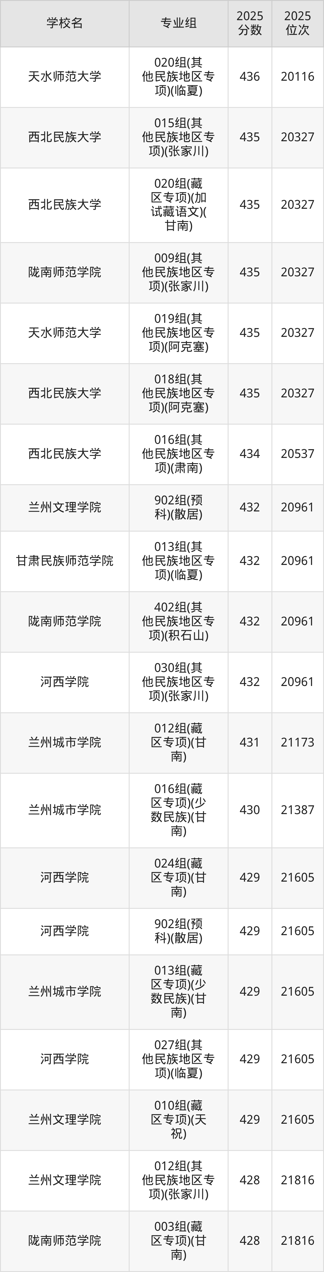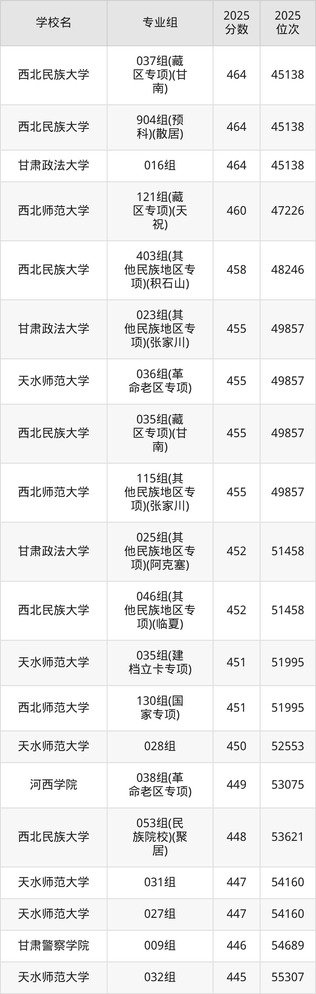 分数线排名最后的文科大学是西北民族大学026组(民语类及对等培养)(加试蒙语文)(301分),除此之外,收分较低的院校还有:甘肃民族师范学院020组(民语类及对等培养)(加试藏语文)332分、甘肃民族师范学院921组(预科)(聚居)332分、兰州文理学院006组(藏区专项)(加试藏语文)(甘南)360分、西北师范大学085组(藏区专项)(加试藏语文)(天祝)364分。