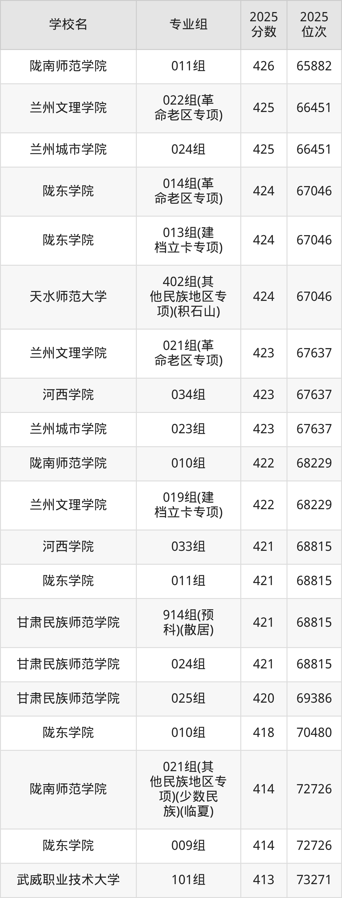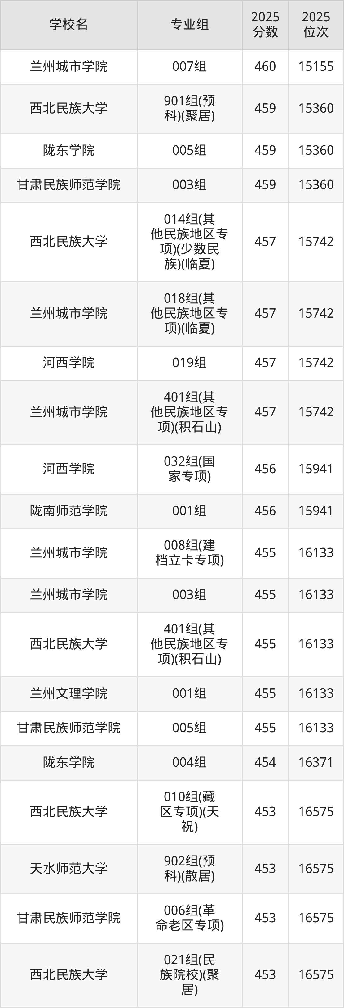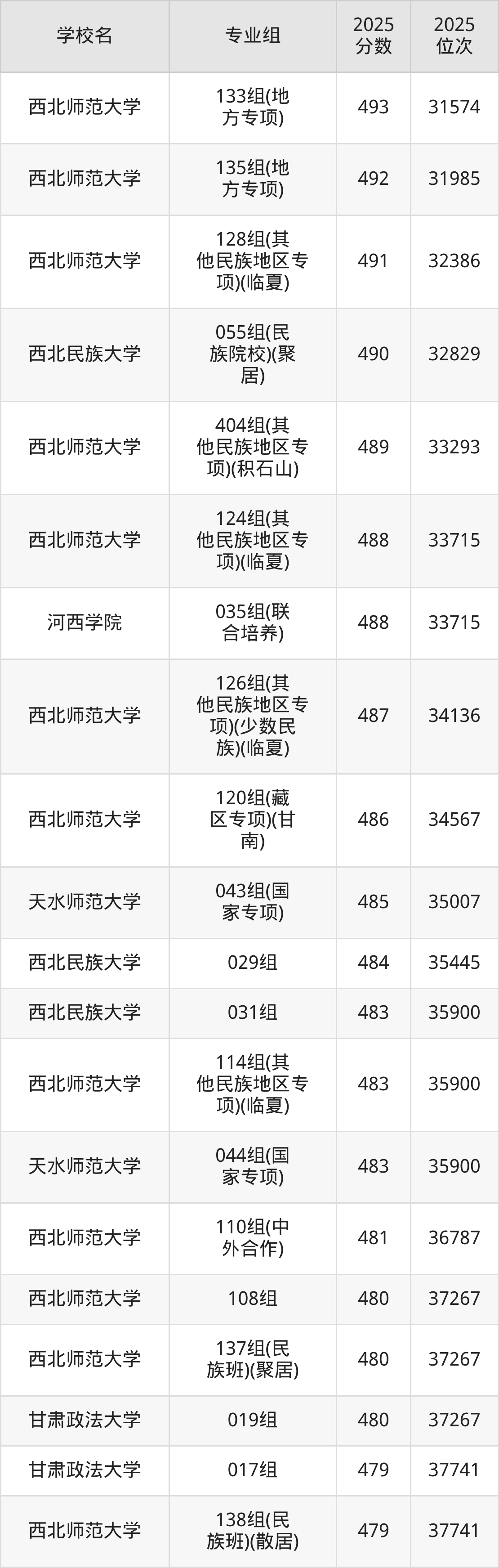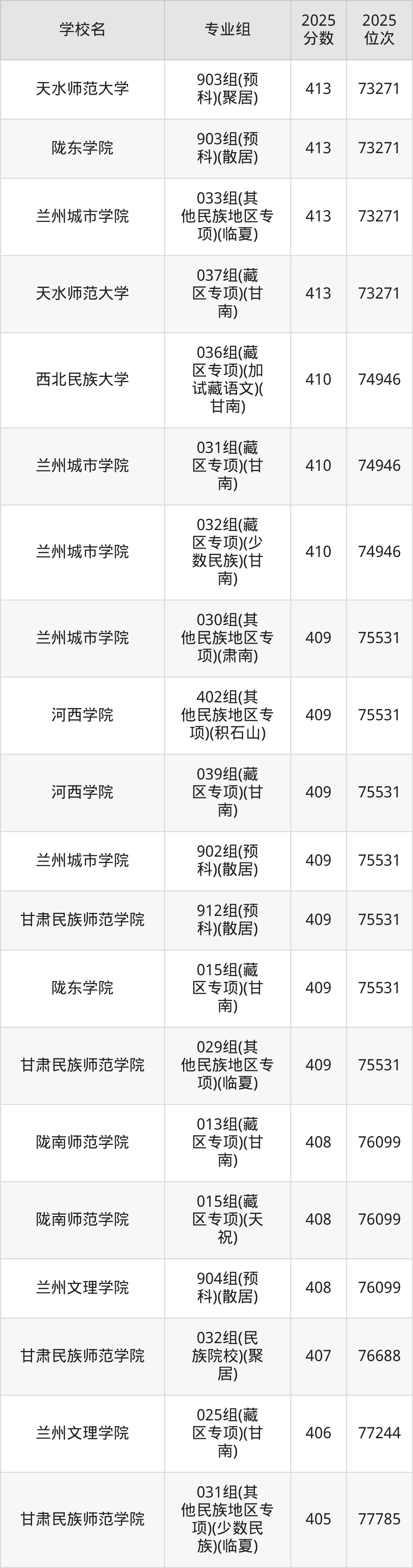 分数线排名最后的文科大学是西北民族大学026组(民语类及对等培养)(加试蒙语文)(301分),除此之外,收分较低的院校还有:甘肃民族师范学院020组(民语类及对等培养)(加试藏语文)332分、甘肃民族师范学院921组(预科)(聚居)332分、兰州文理学院006组(藏区专项)(加试藏语文)(甘南)360分、西北师范大学085组(藏区专项)(加试藏语文)(天祝)364分。