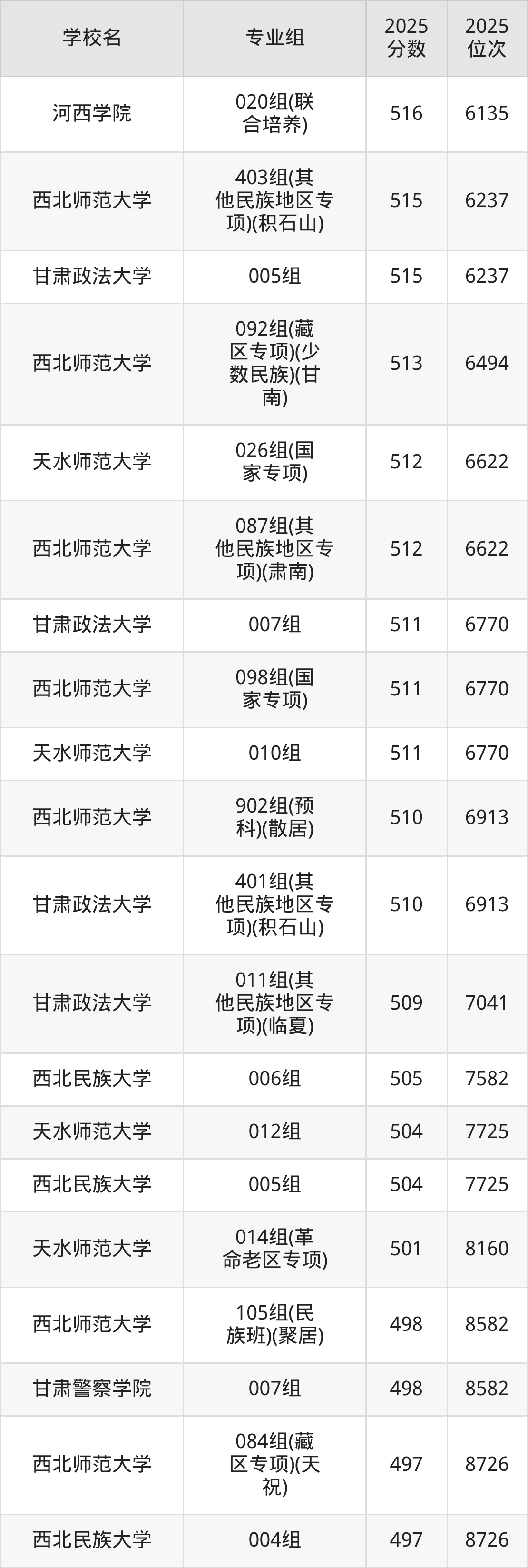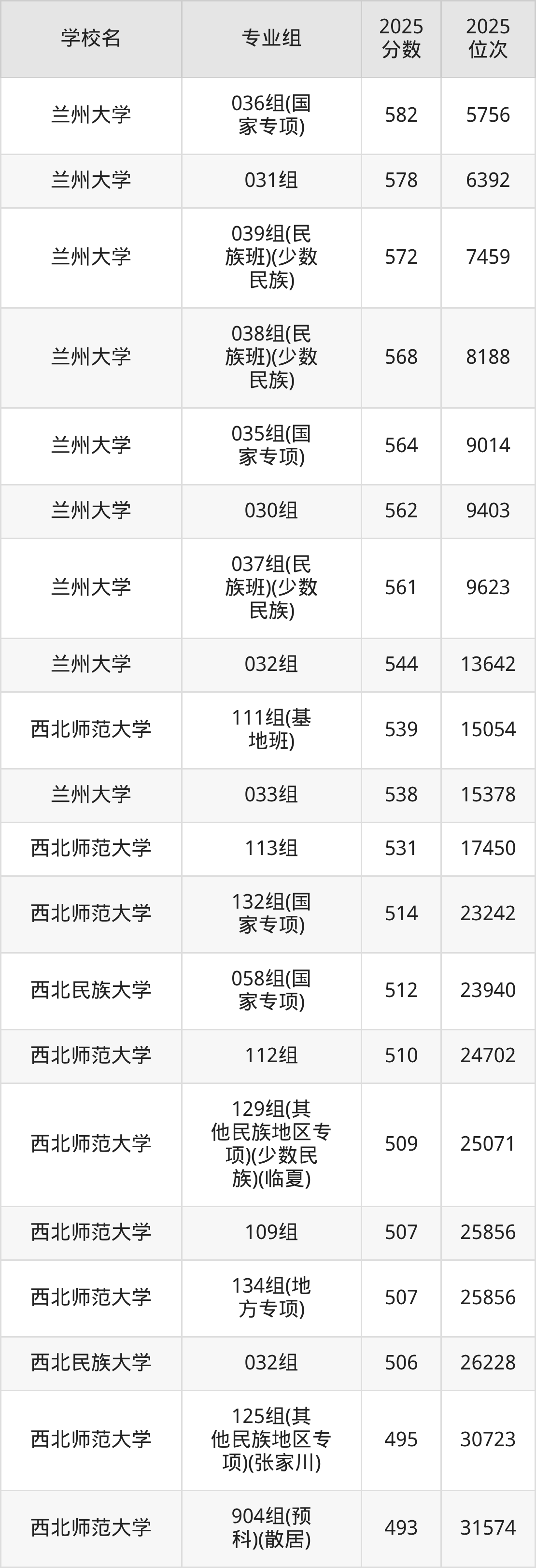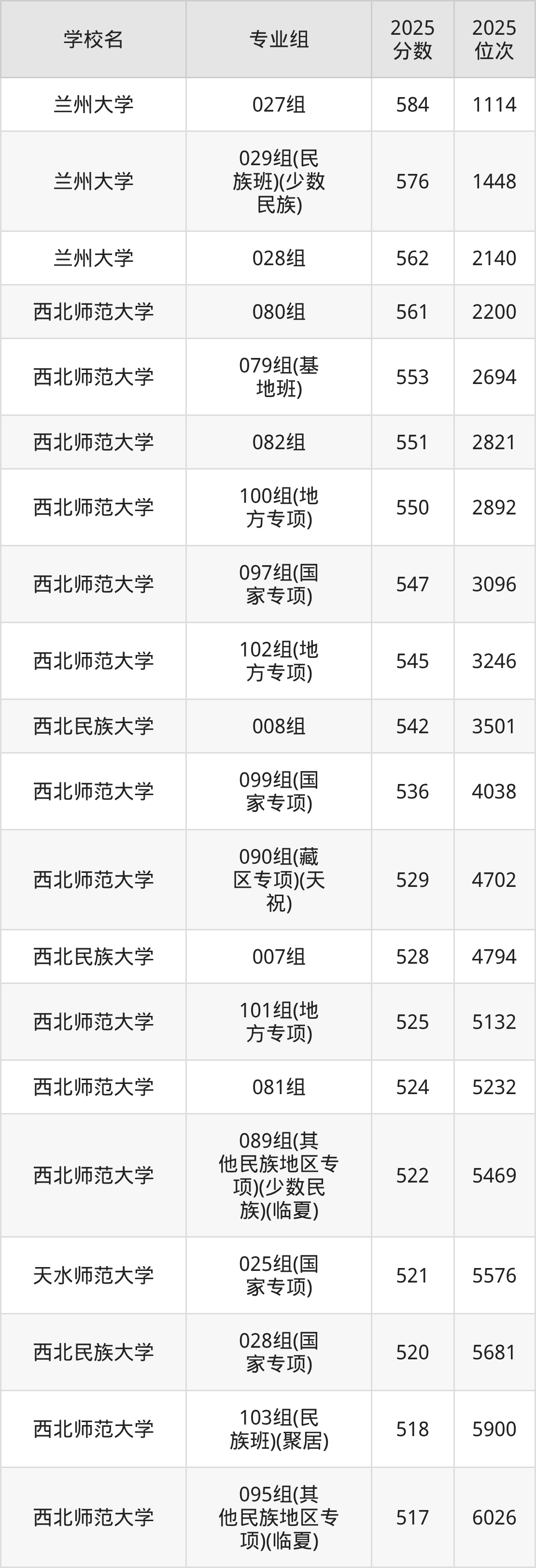 其中,分数线排名第一的文科大学是兰州大学027组,除此之外,收分较高的院校还有:兰州大学029组(民族班)(少数民族)576分、兰州大学028组562分、西北师范大学080组561分、西北师范大学079组(基地班)553分。