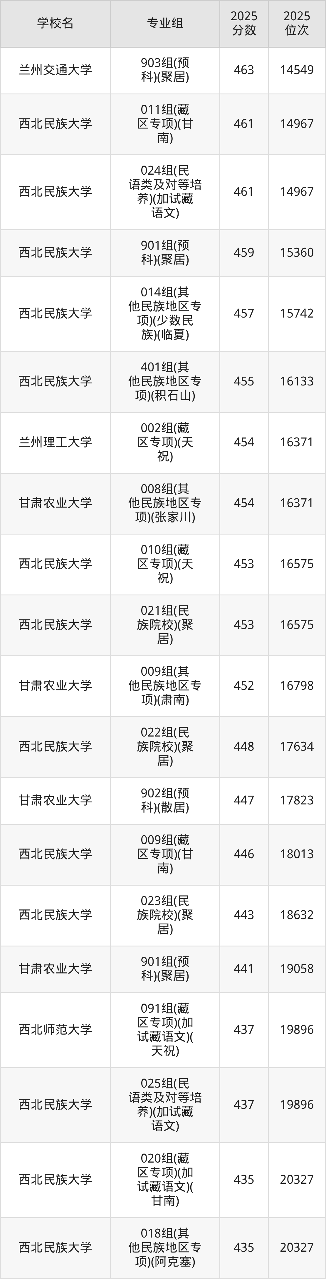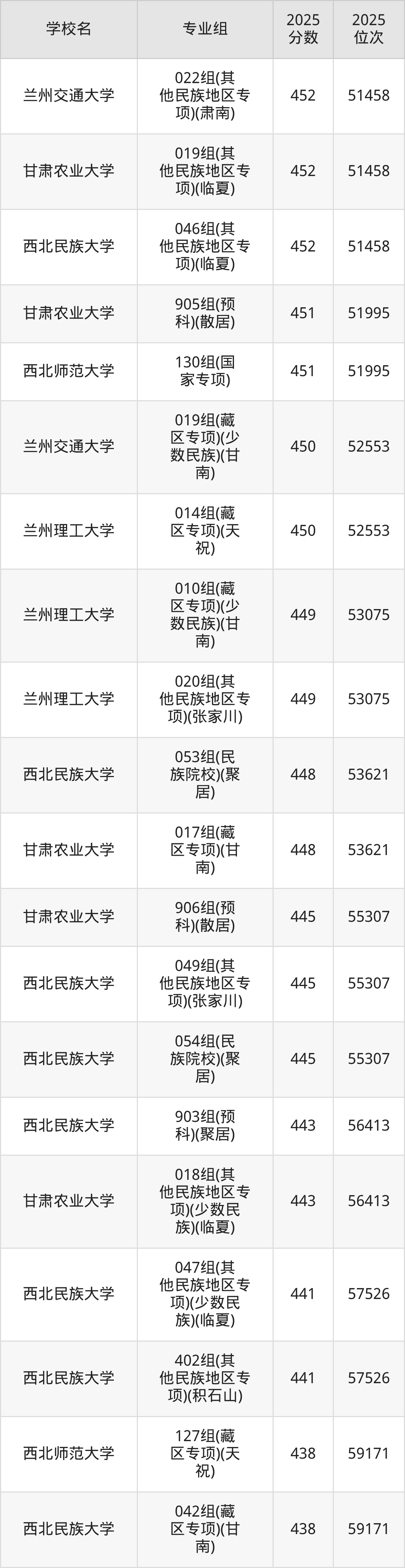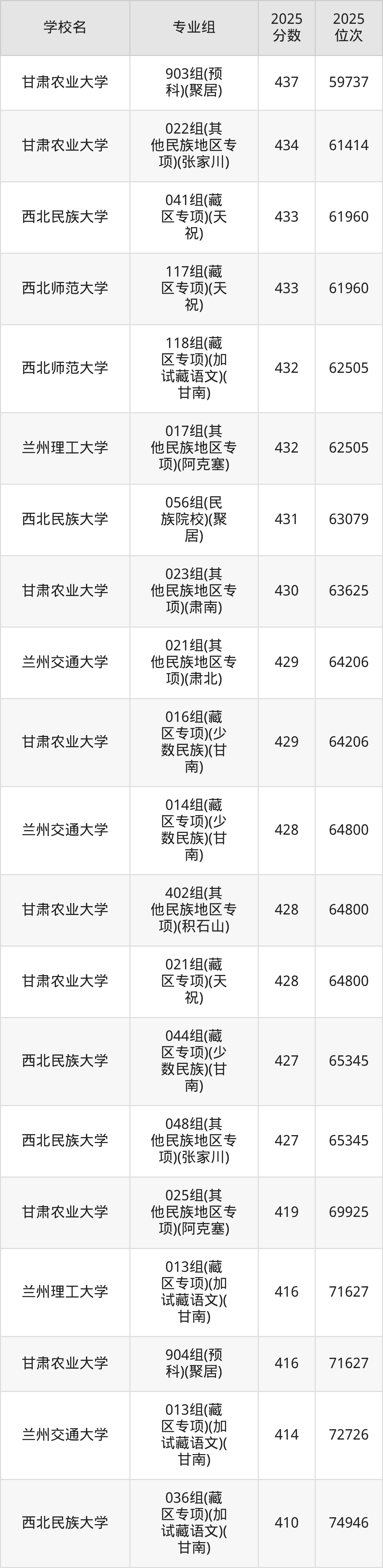 分数线排名最后的重点大学是西北民族大学051组(其他民族地区专项)(肃北)(337分),除此之外,收分较低的院校还有:西北民族大学034组(其他民族地区专项)(肃北)342分、甘肃农业大学020组(藏区专项)(加试藏语文)(天祝)350分、甘肃农业大学024组(其他民族地区专项)(肃北)362分、西北民族大学052组(其他民族地区专项)(阿克塞)370分。