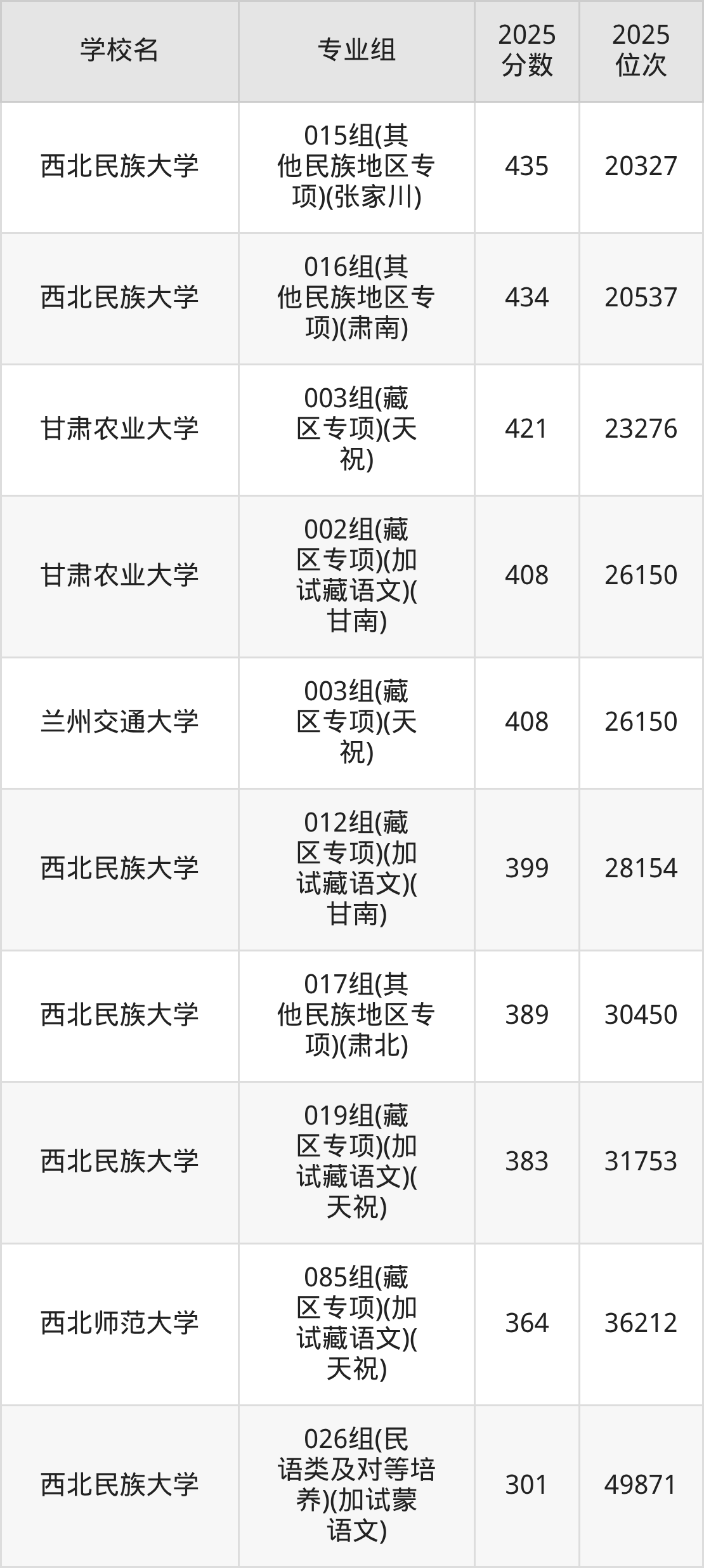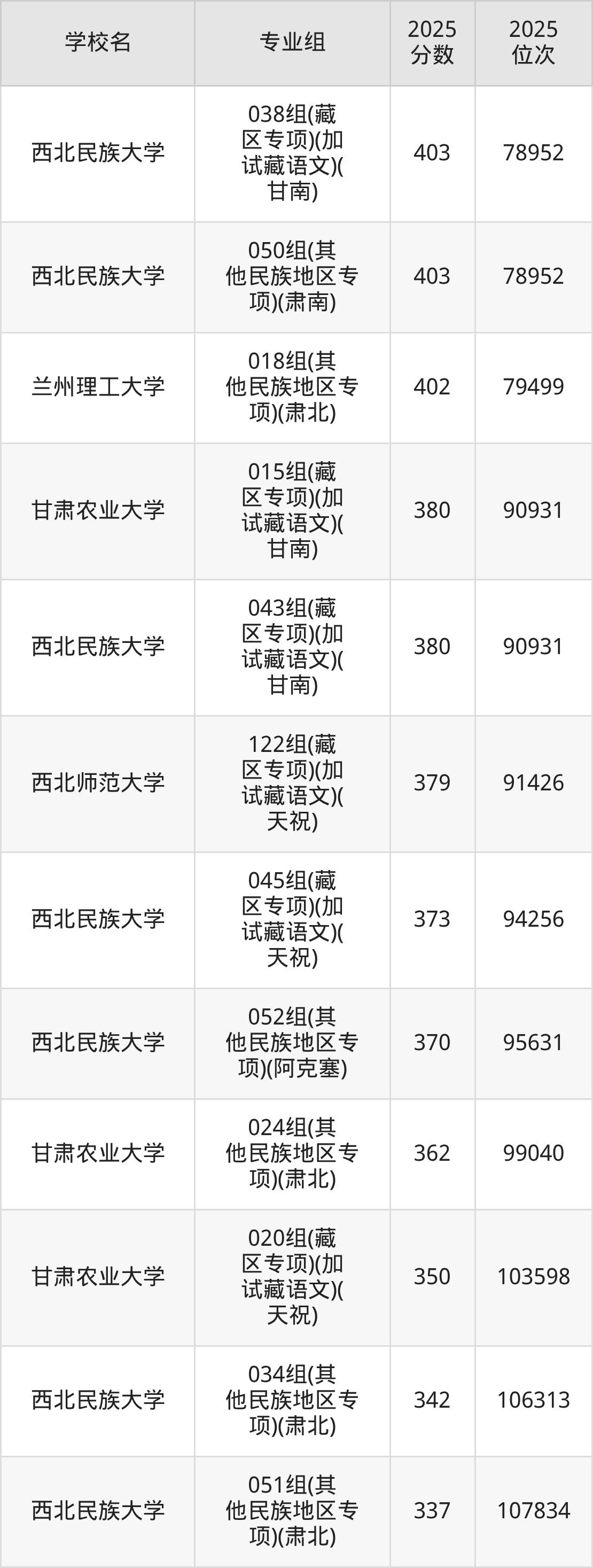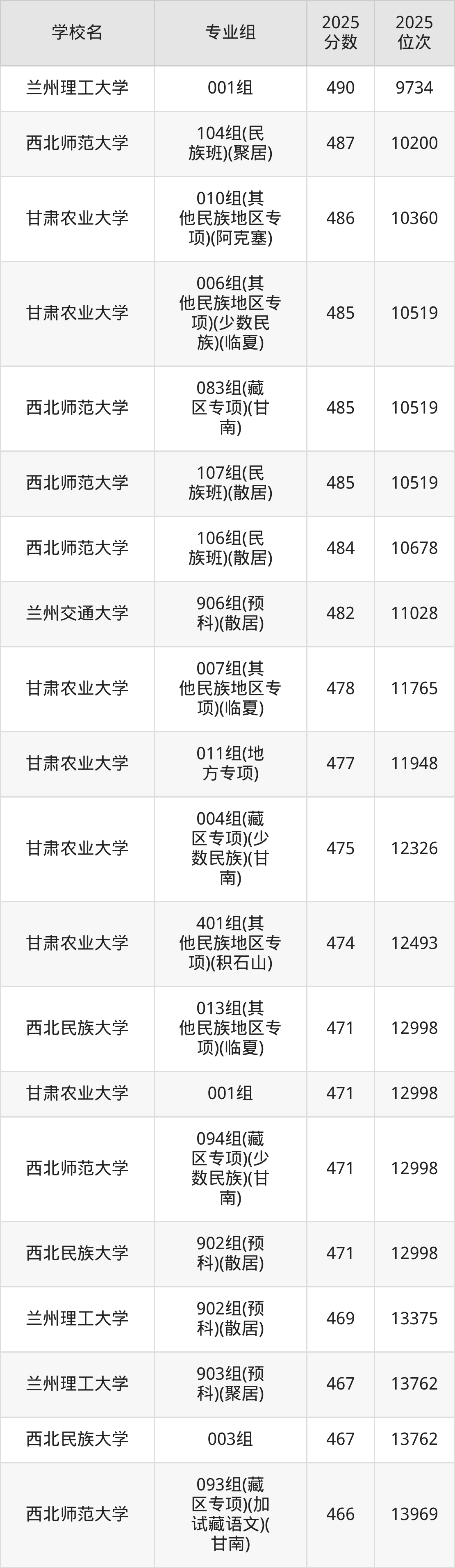 分数线排名最后的重点大学是西北民族大学026组(民语类及对等培养)(加试蒙语文)(301分),除此之外,收分较低的院校还有:西北师范大学085组(藏区专项)(加试藏语文)(天祝)364分、西北民族大学019组(藏区专项)(加试藏语文)(天祝)383分、西北民族大学017组(其他民族地区专项)(肃北)389分、西北民族大学012组(藏区专项)(加试藏语文)(甘南)399分。