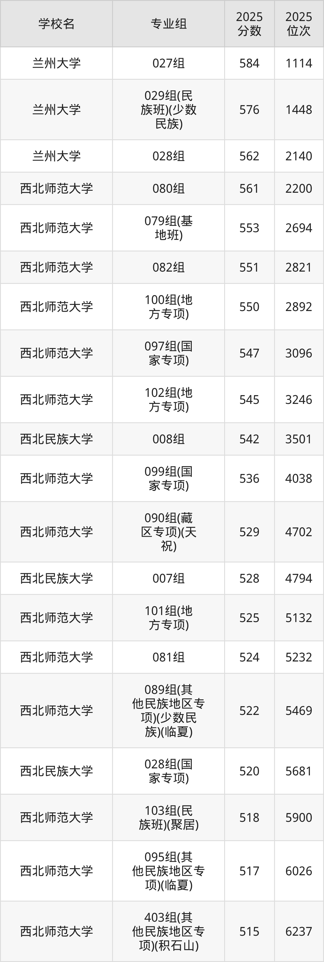 其中,分数线排名第一的重点大学是兰州大学027组,除此之外,收分较高的院校还有:兰州大学029组(民族班)(少数民族)576分、兰州大学028组562分、西北师范大学080组561分、西北师范大学079组(基地班)553分。