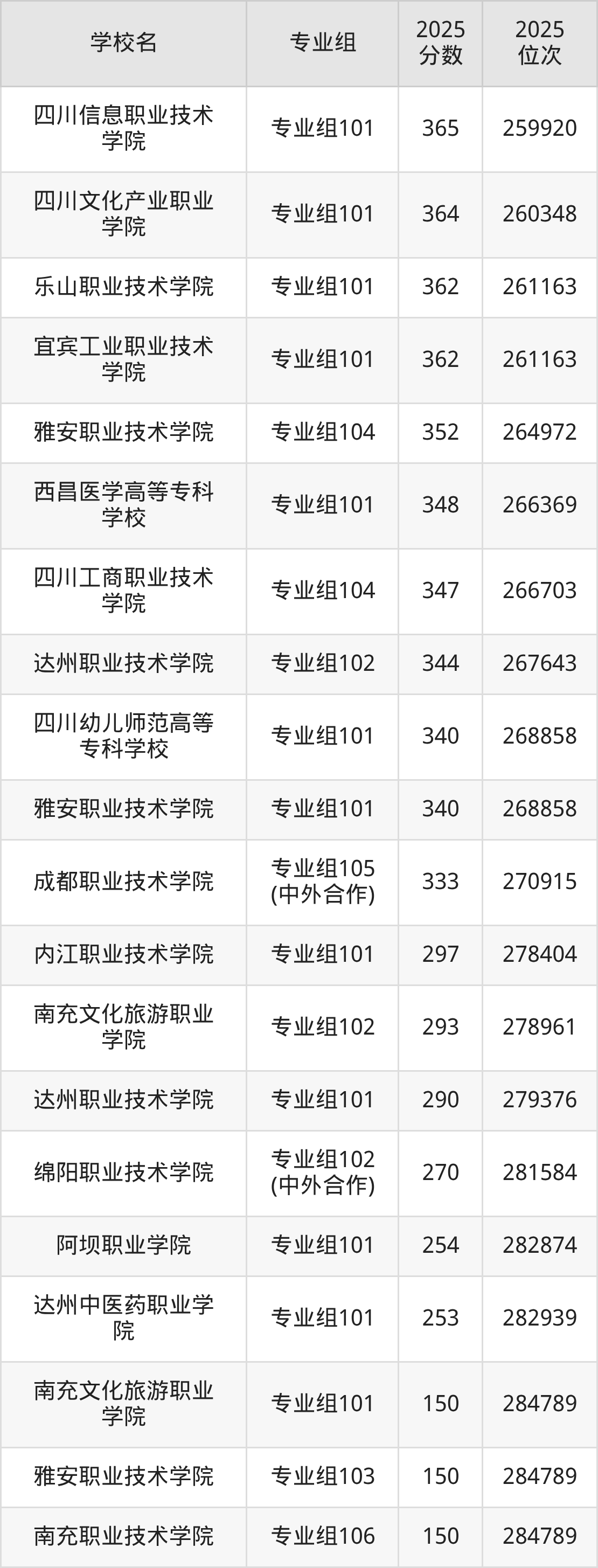 分数线排名最后的公办大专院校是南充文化旅游职业学院专业组101(150分)、雅安职业技术学院专业组103(150分)等,除此之外,收分较低的院校还有:达州中医药职业学院专业组101253分、阿坝职业学院专业组101254分、绵阳职业技术学院专业组102(中外合作)270分、达州职业技术学院专业组101290分。
