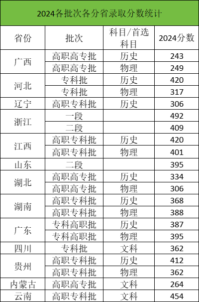 2024年桂林师范高等专科学校专科批招生,各省最低录取分数线如下: