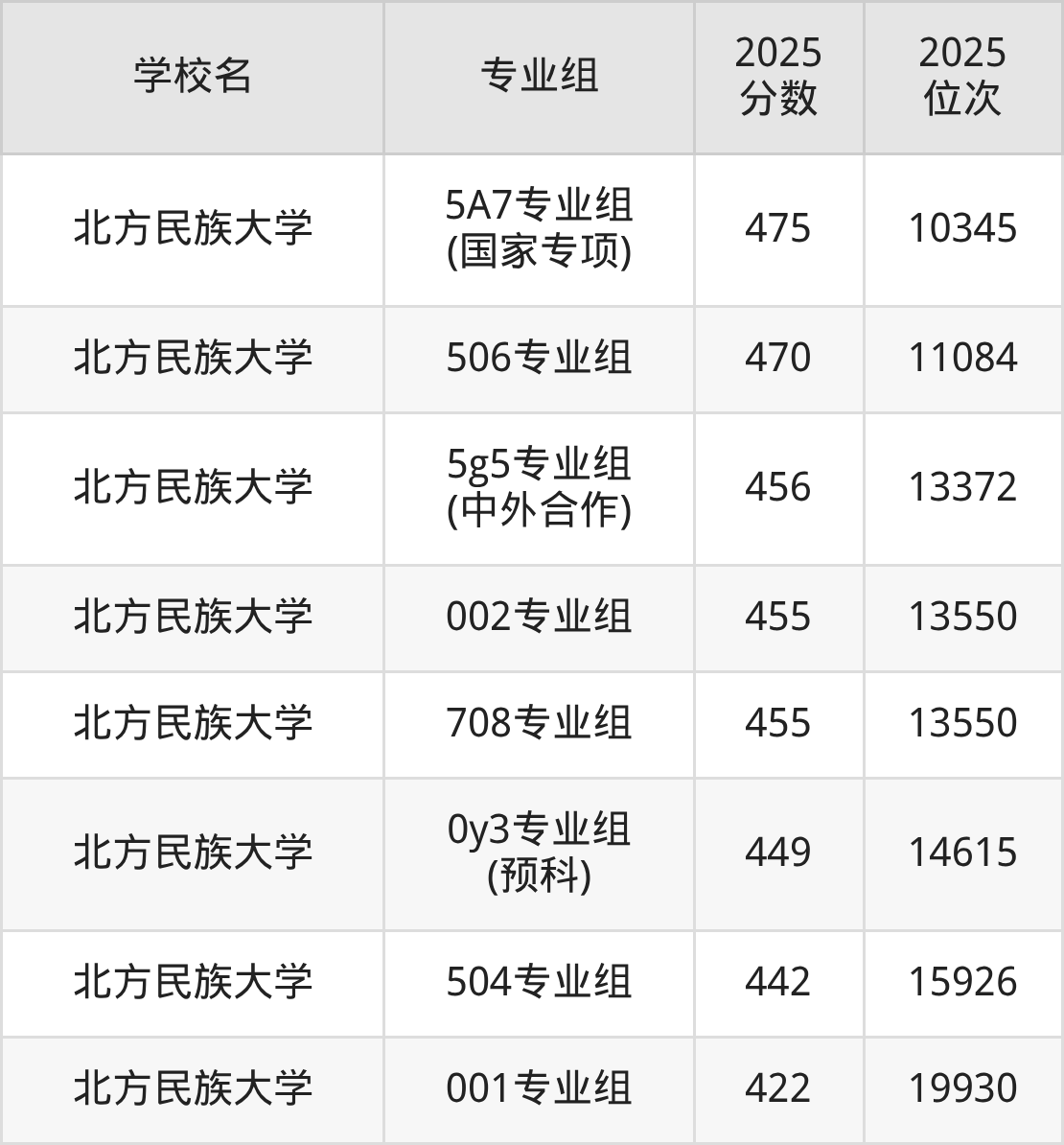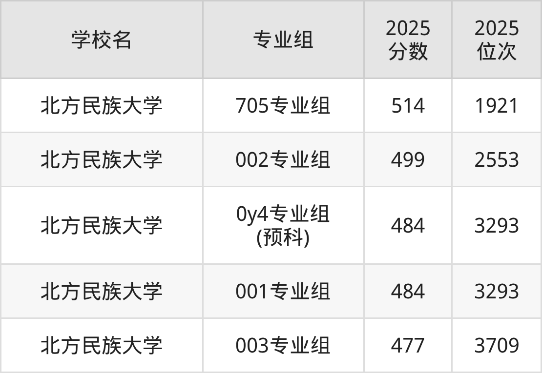 分数线排名最后的民族类大学是北方民族大学003专业组(477分)。