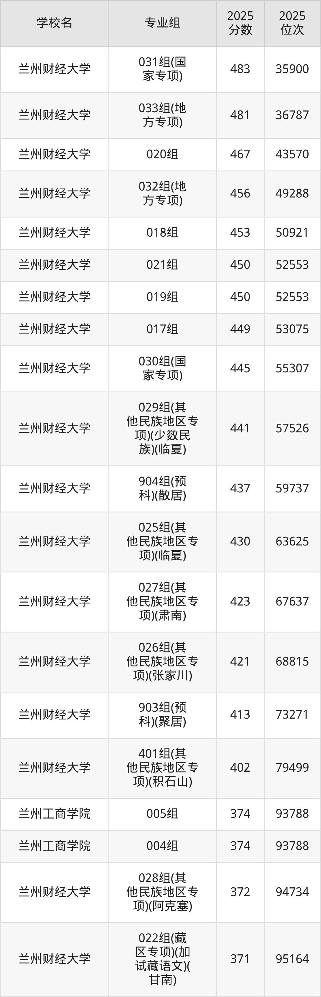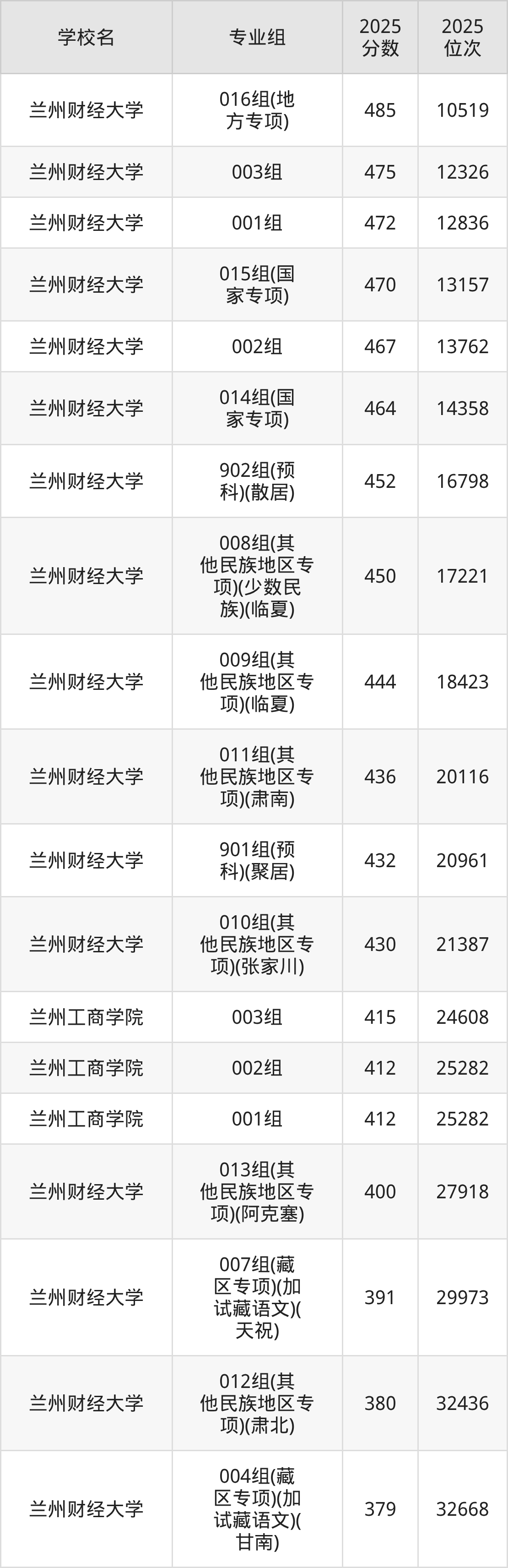 其中,分数线排名第一的财经类大学是兰州财经大学016组(地方专项),除此之外,收分较高的院校还有:兰州财经大学003组475分、兰州财经大学001组472分、兰州财经大学015组(国家专项)470分、兰州财经大学002组467分。