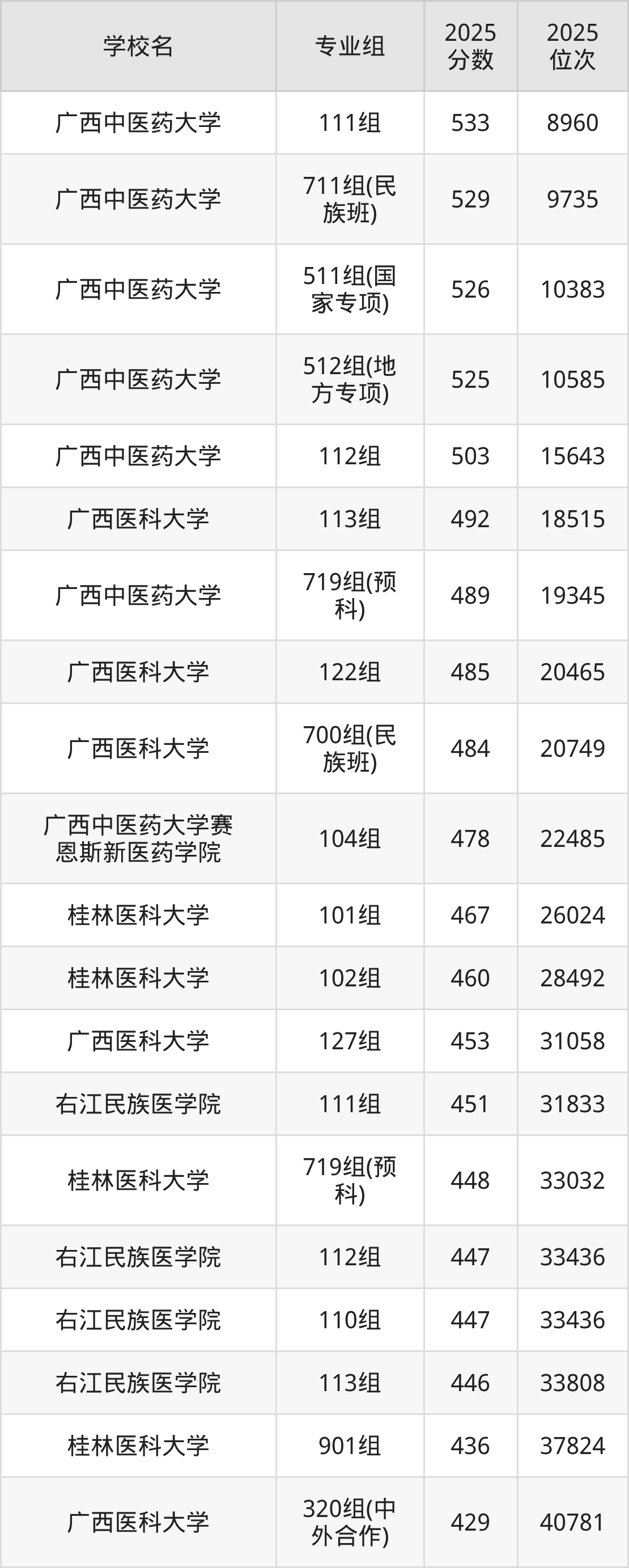 2026广西医药类大学排名前四的有:广西医科大学、广西中医药大学、桂林医科大学、右江民族医学院。2025年广西医药类大学录取分数线最低是:历史类429分、物理类370分,各校具体分数线请看下文。