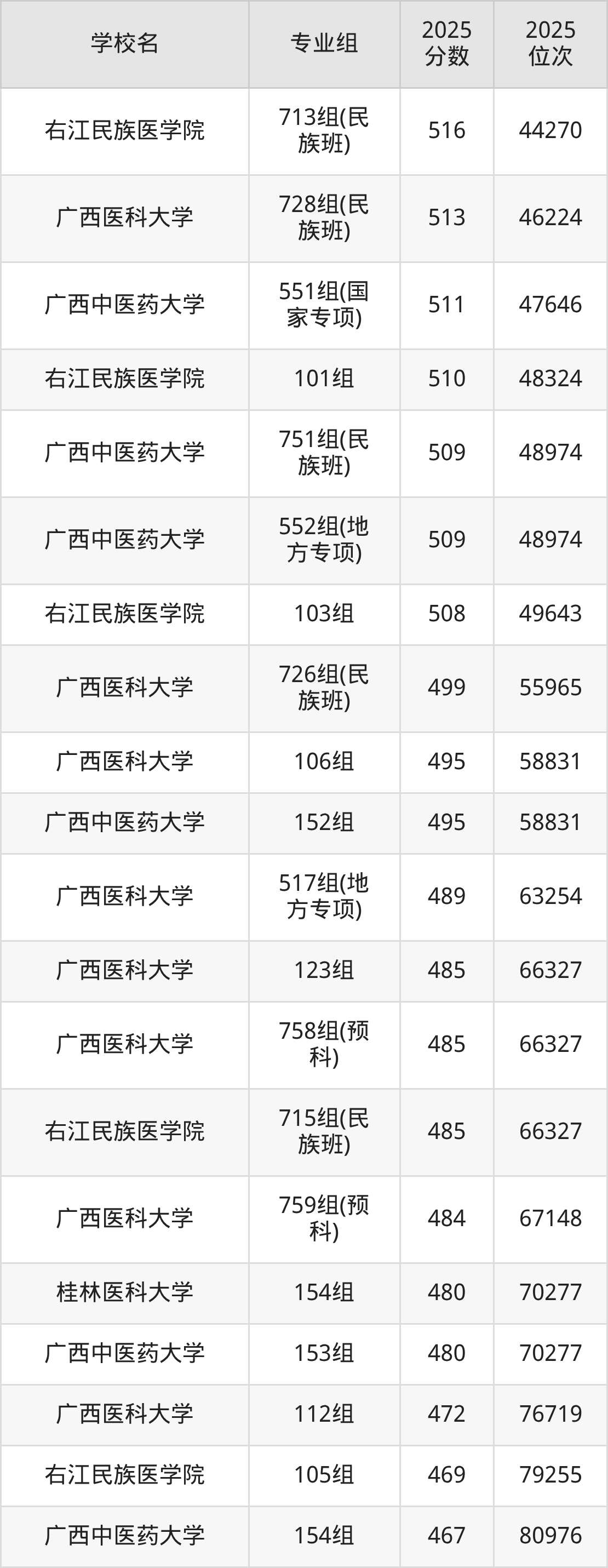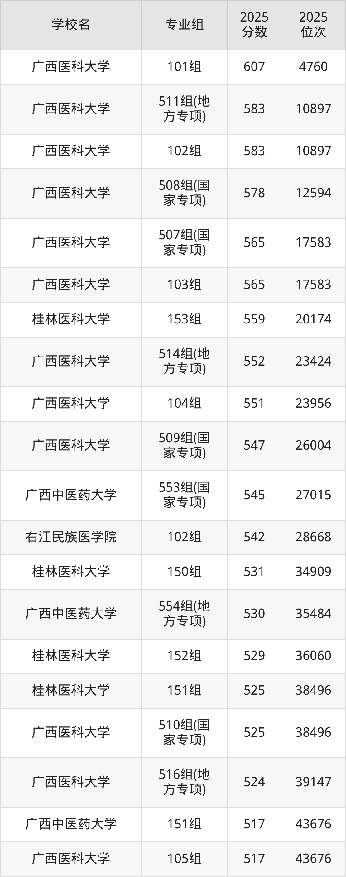 其中,分数线排名第一的医药类大学是广西医科大学101组,除此之外,收分较高的院校还有:广西医科大学511组(地方专项)583分、广西医科大学102组583分、广西医科大学508组(国家专项)578分、广西医科大学507组(国家专项)565分。