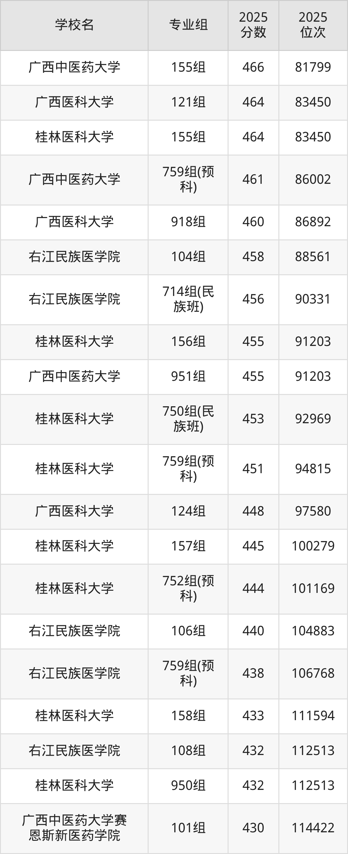 分数线排名最后的医药类大学是广西医科大学320组(中外合作)(429分),除此之外,收分较低的院校还有:桂林医科大学901组436分、右江民族医学院113组446分、右江民族医学院110组447分、右江民族医学院112组447分。