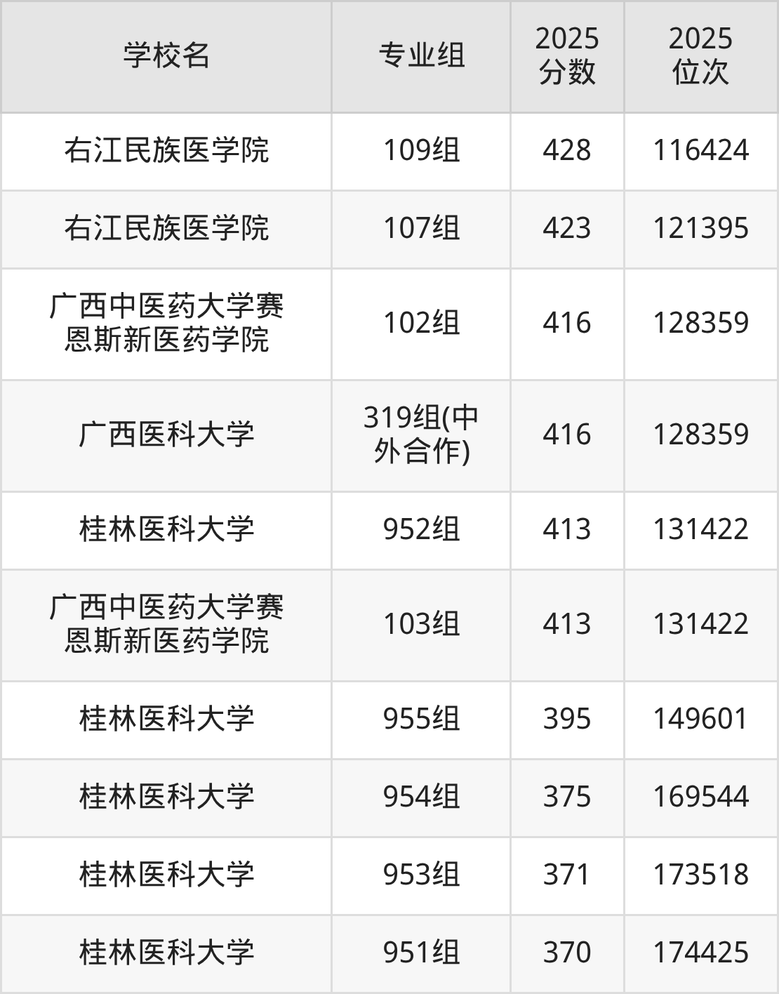 分数线排名最后的医药类大学是桂林医科大学951组(370分),除此之外,收分较低的院校还有:桂林医科大学953组371分、桂林医科大学954组375分、桂林医科大学955组395分、桂林医科大学952组413分。