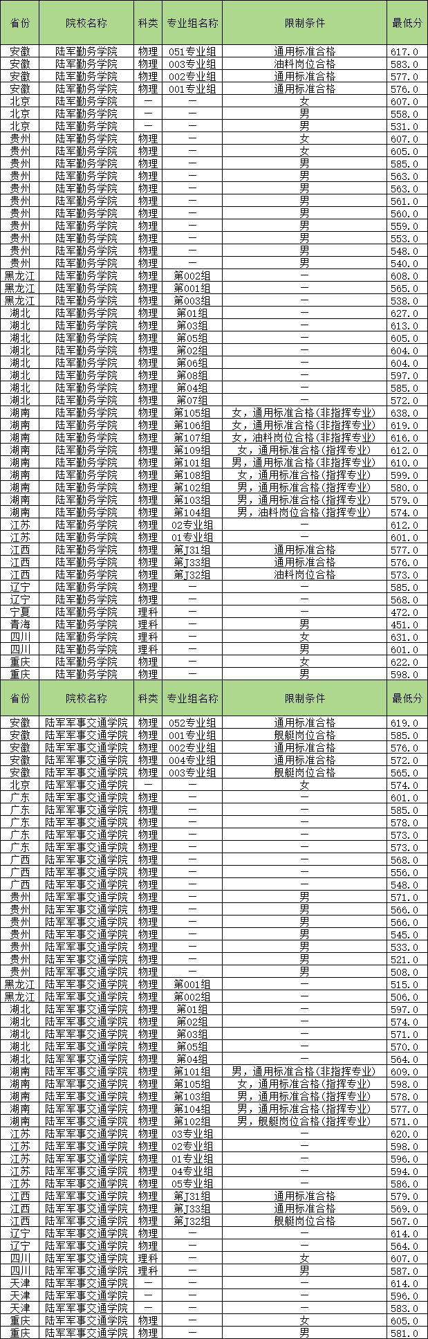 | 联勤保障部队工程大学 | 物理 | 男 | 602 |