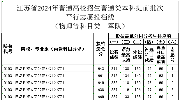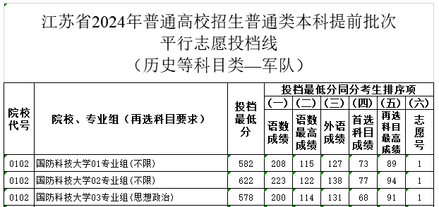 3、2024年国防科技大学在各省的提前批投档线