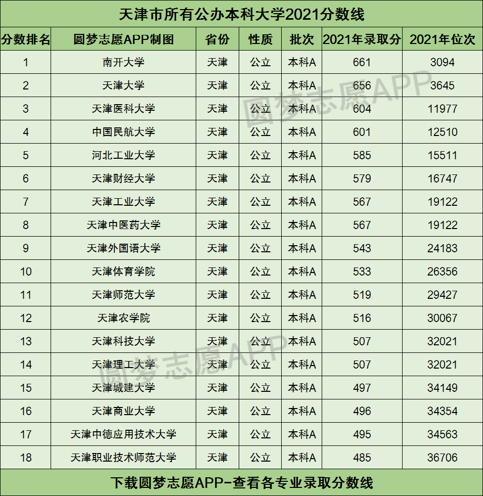 根据下图可知,天津市内的公办本科大学2021年在天津高考的最低分数线为485分,对应的大学为天津职业技术师范大学。而天津市2021年高考本科线为463分,这也就意味着如果你想读天津市内的公立本科大学,那么至少得超过本科线22分才行!