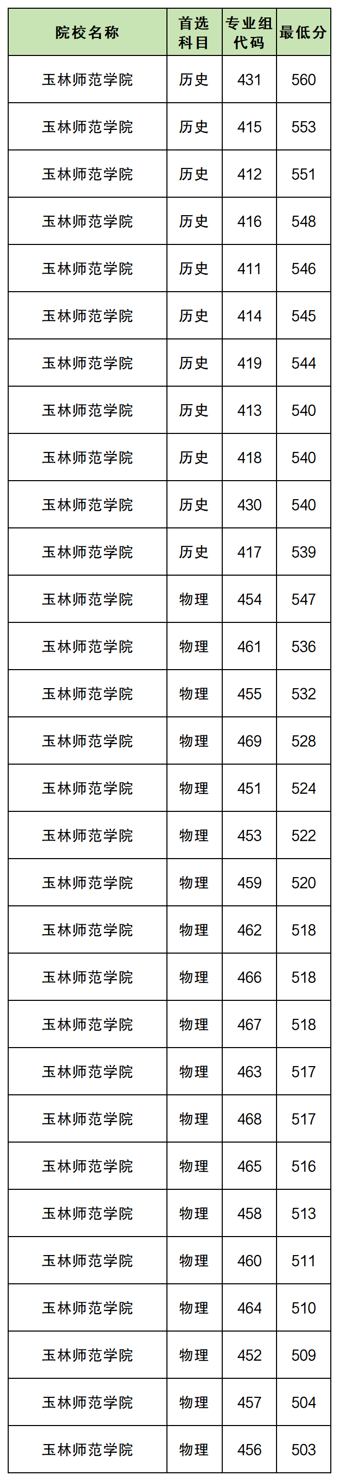 2、玉林师范学院2025年最低分:物理类是503分、历史类是539分。