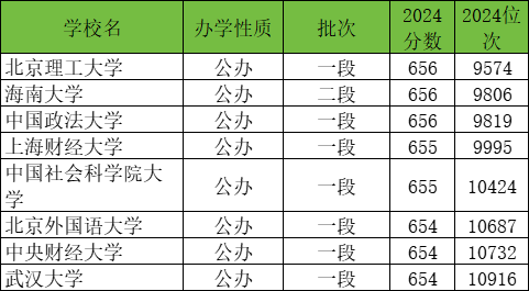 位次1万名左右的考生能上的学校有:北京理工大学(9574名)、海南大学(9806名)、中国政法大学(9819名)、上海财经大学(9995名)、中国社会科学院大学(10424名)、北京外国语大学(10687名)等。