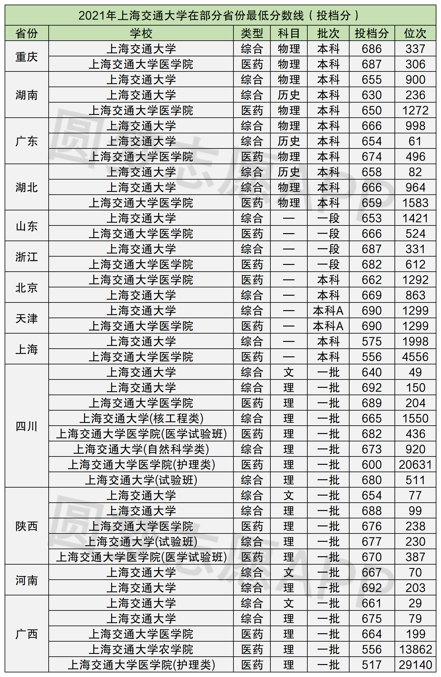 1、2021年上海交通大学在部分省份分数线(投档分)