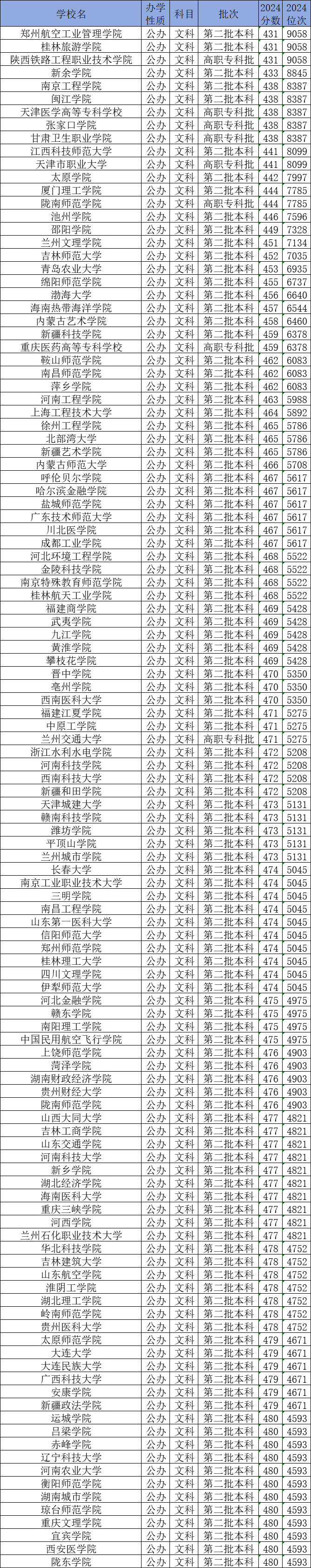 下面是文科生430-480分能上的大学名单一览表: