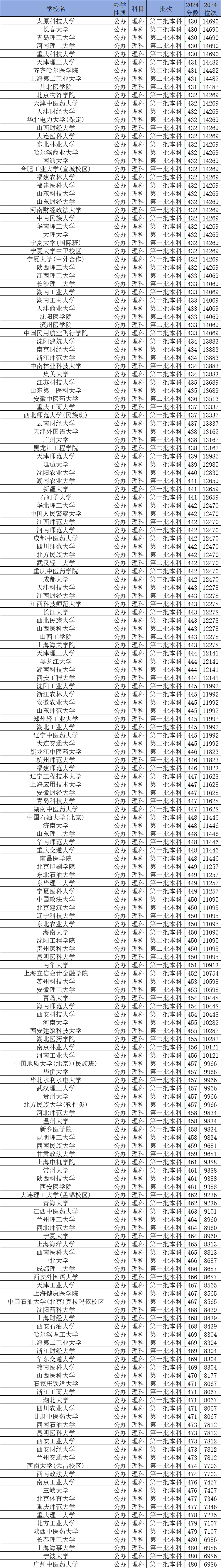 下面是理科生430-480分能上的大学名单一览表:
