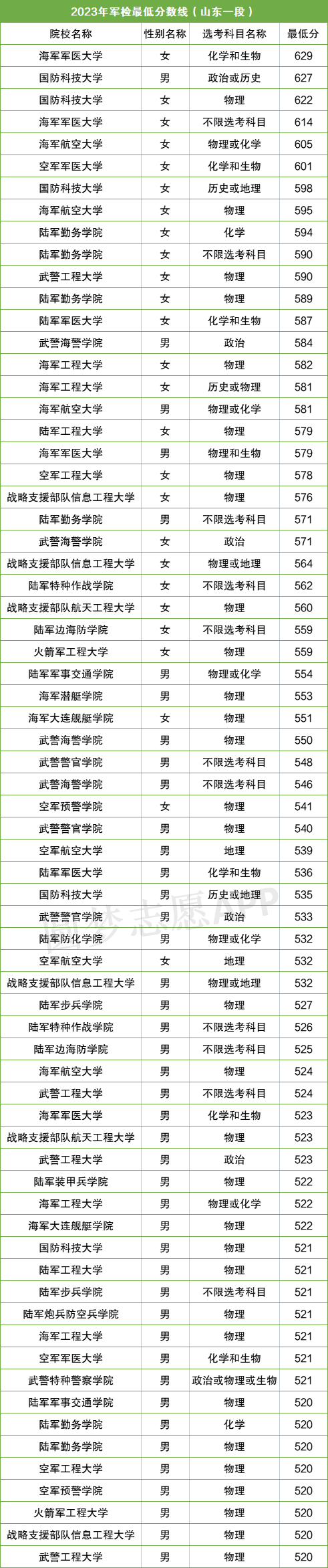 二.2023年山东军校最低录取分数线一览表