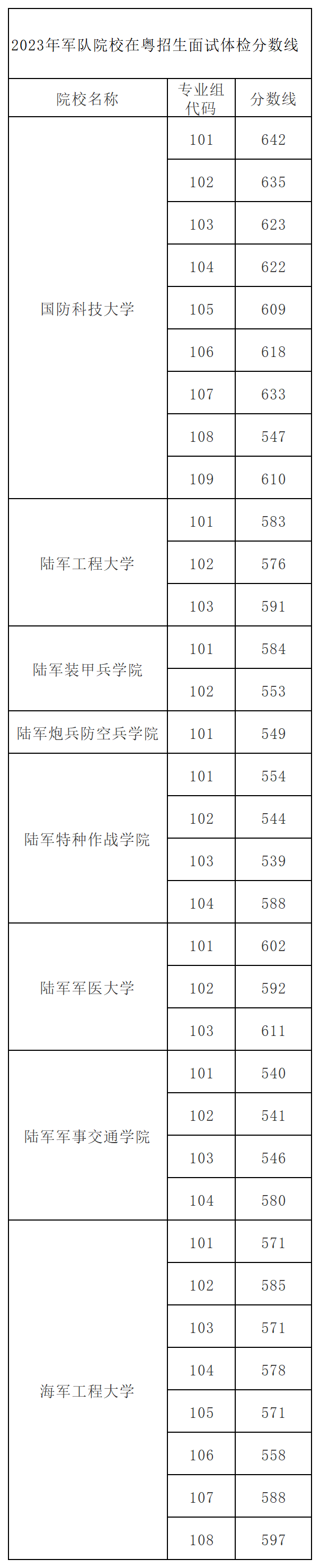 2023年共有8所军校在广东招生,其中录取分最高的是国防科技大学101组,2023年的投档线是642分;录取分最低的是陆军特种作战学院103组,2023年的投档线是539分。