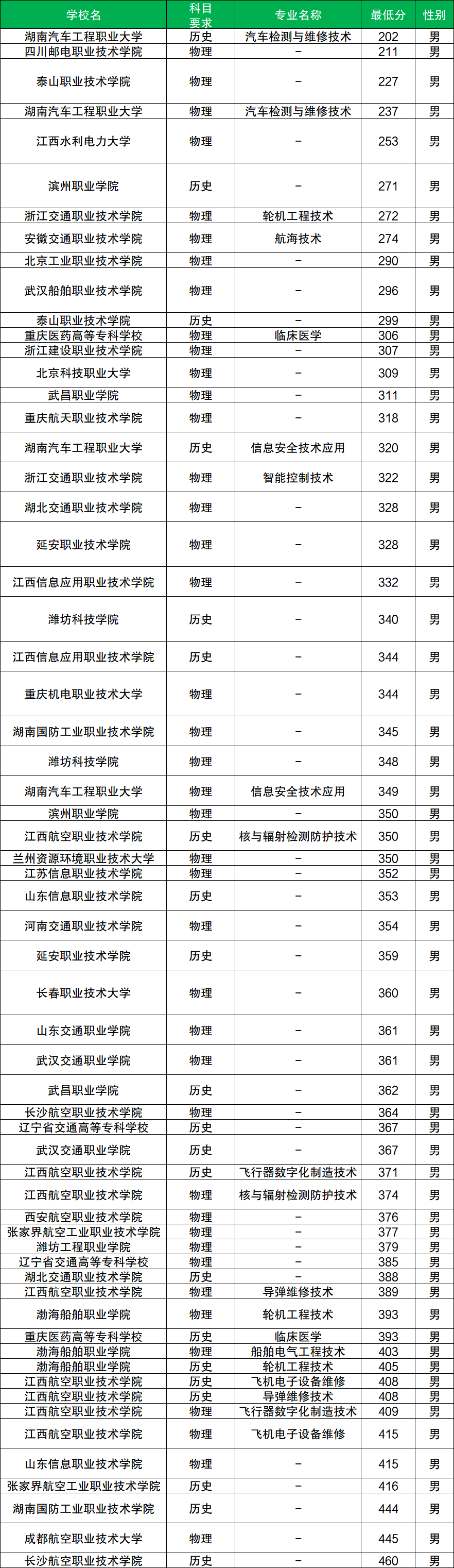 其中物理类分数至少在209分及以上、历史类分数至少在227分及以上才有机会被录取。而物理类分数最低的院校是长沙航空职业技术学院,历史类分数最低的院校是武昌职业学院。