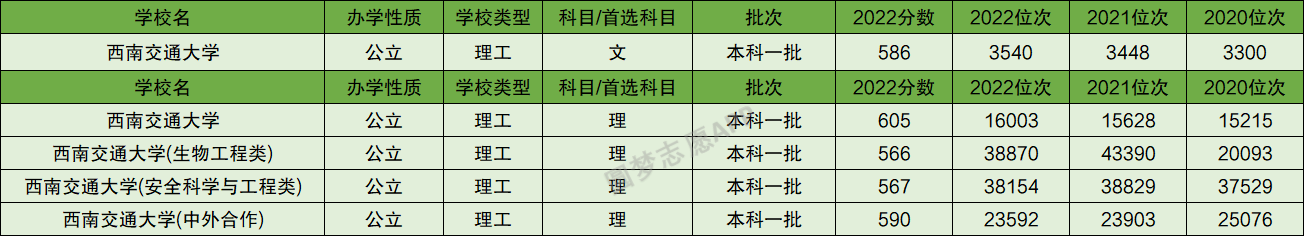 根据上图可知,西南交通大学2022年在四川省本科一批文科的投档分数线为586分,理科投档分数线为605分;西南交通大学(生物工程类)在四川理科的投档分数线为566分;西南交通大学(安全科学与工程类)在四川理科的投档分数线为567分;西南交通大学(中外合作)在四川理科的投档分数线为590分。