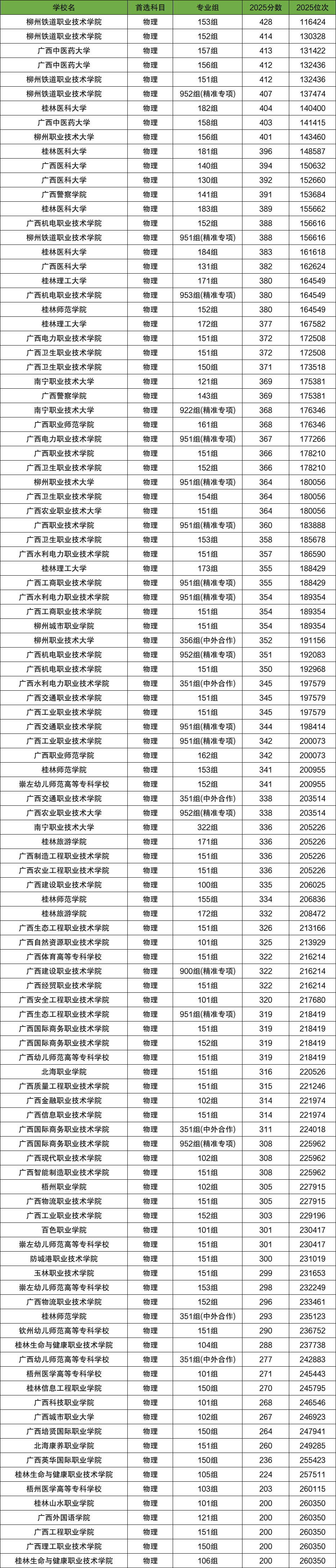 最难考的是柳州铁道职业技术学院153组,2025年录取最低分428分,对应区位次是116424名;最好考的是桂林生命与健康职业技术学院106组、广西理工职业技术学院150组等,2025年最低分200分,对应区位次是260350名。