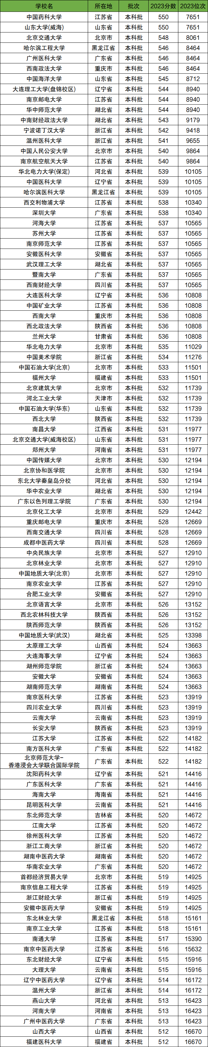 以下为2023年在上海市500到550分的全国大学名单(上海市以外)。