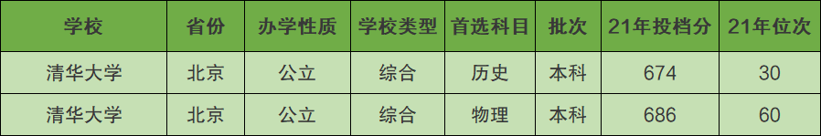 根据上图可知,清华大学在2021年河北首选历史类中,最低投档分数线为674分,最低位次排名为全省第30名。因此如果河北省首选历史类考生想要考上清华大学,建议要努力考到河北省首选历史类考生中的全省前30名。