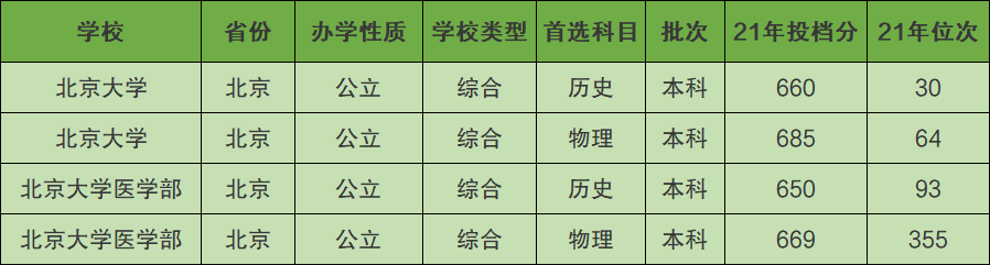 同理在河北省首选历史考生中,2021年北京大学最低投档分数线为660分,对应河北省首选历史考生全省位次排名第30名。
