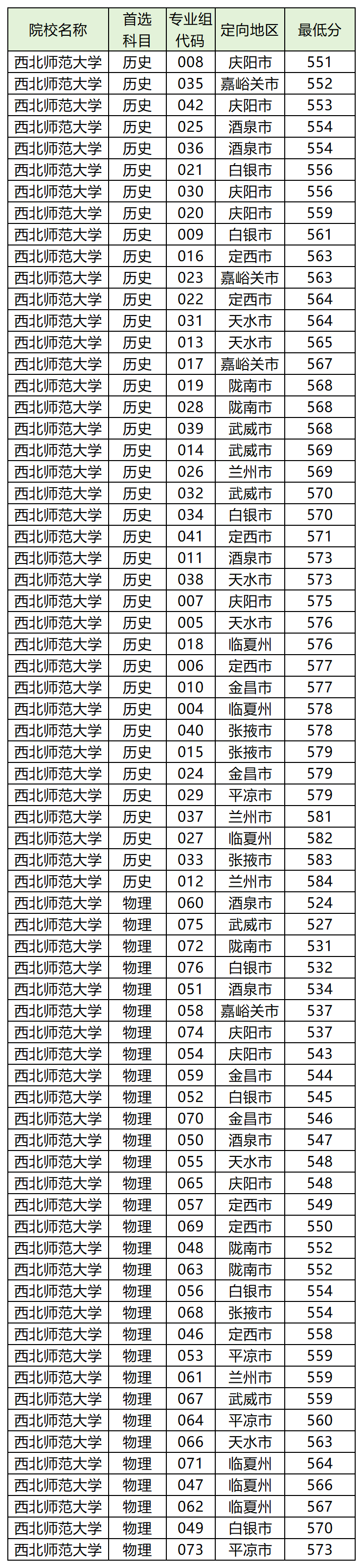 西北师范大学2025年最低分:物理类是524分、历史类是551分。