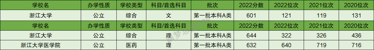 根据上图可知,浙江大学2022年在山西省本科一批文科的投档分数线为601分,理科投档分数线为644分;浙江大学医学院在山西理科的投档分数线为632分。