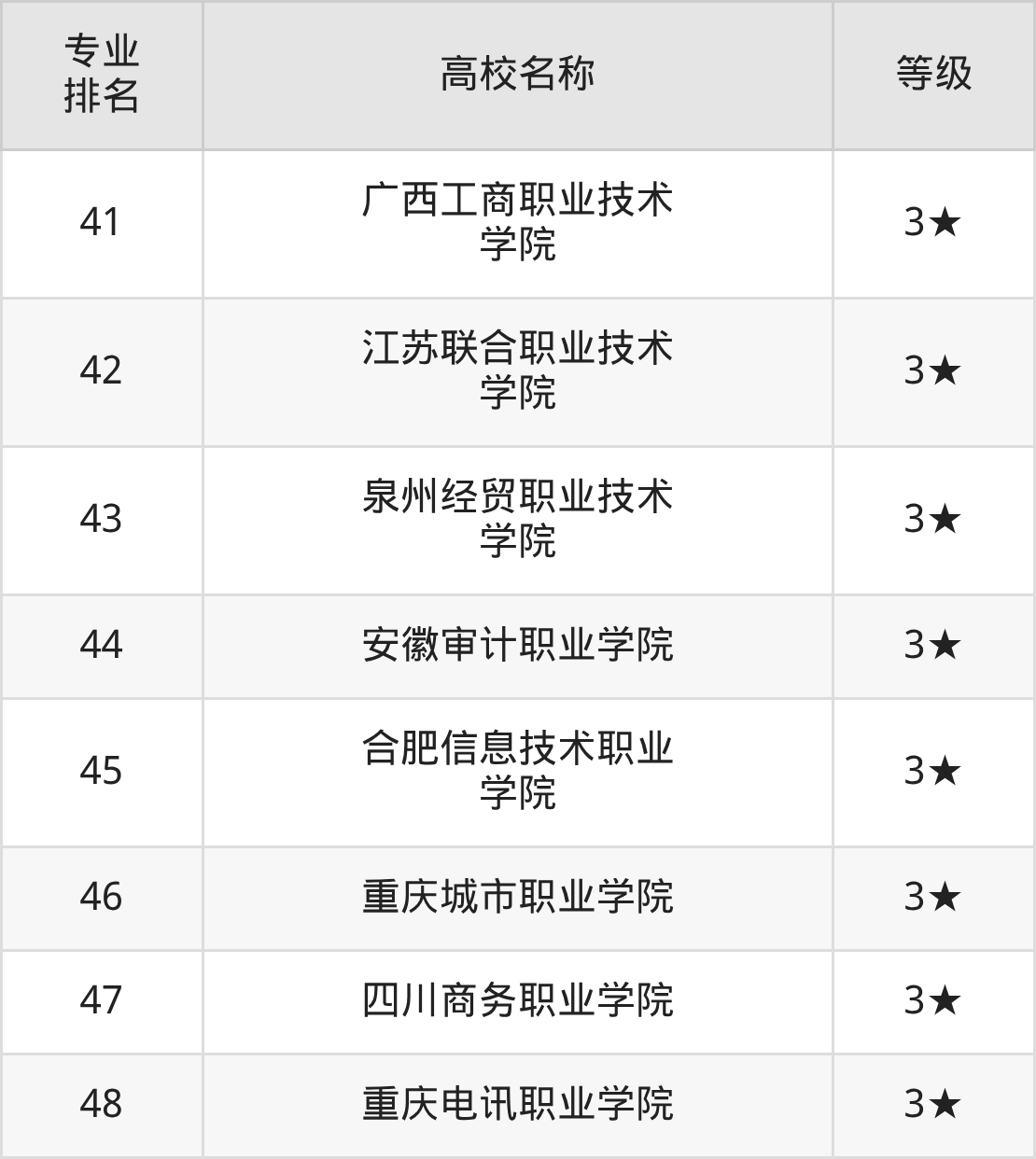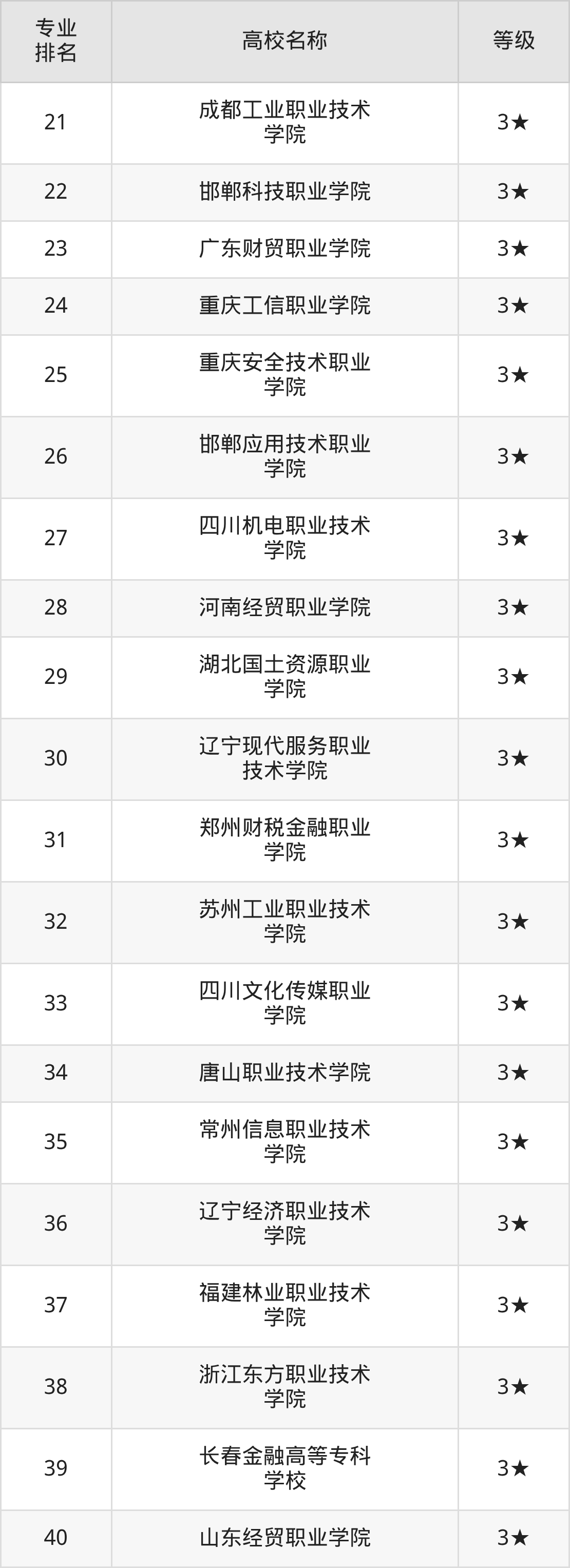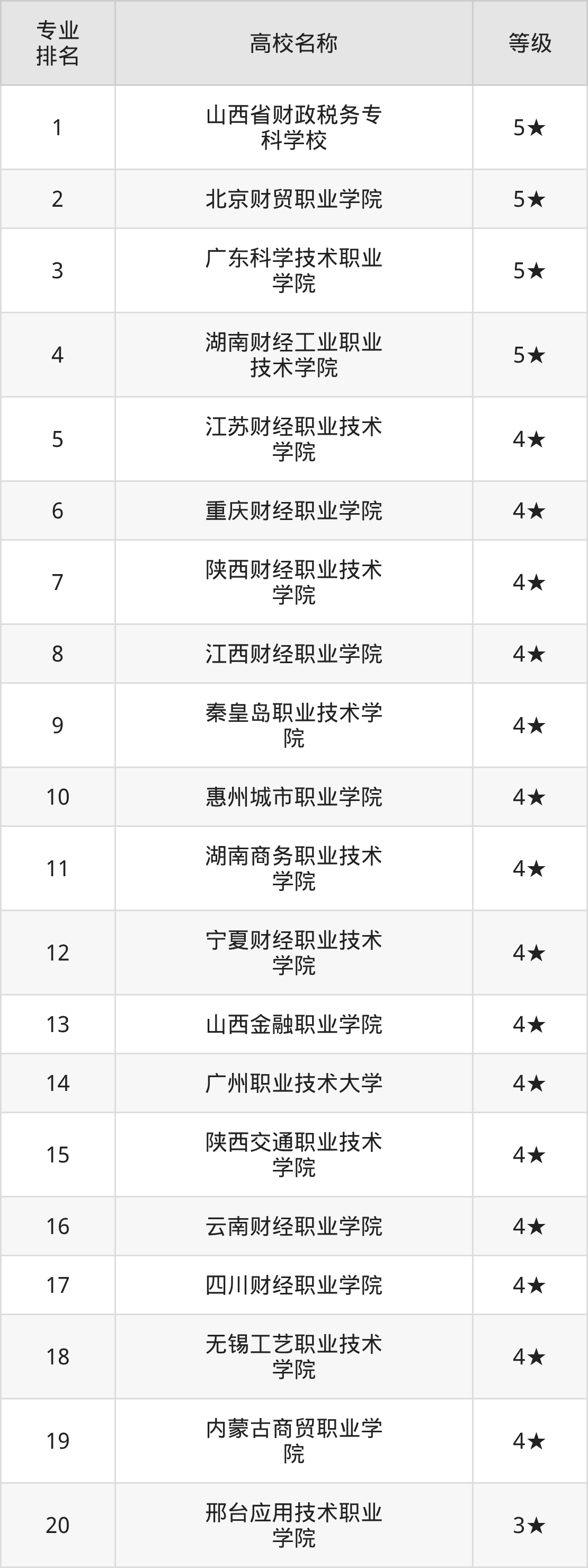 水平等级是4星级的有15所,为 江苏财经职业技术学院(全国第5名)、重庆财经职业学院(全国第6名)、陕西财经职业技术学院(全国第7名)等。