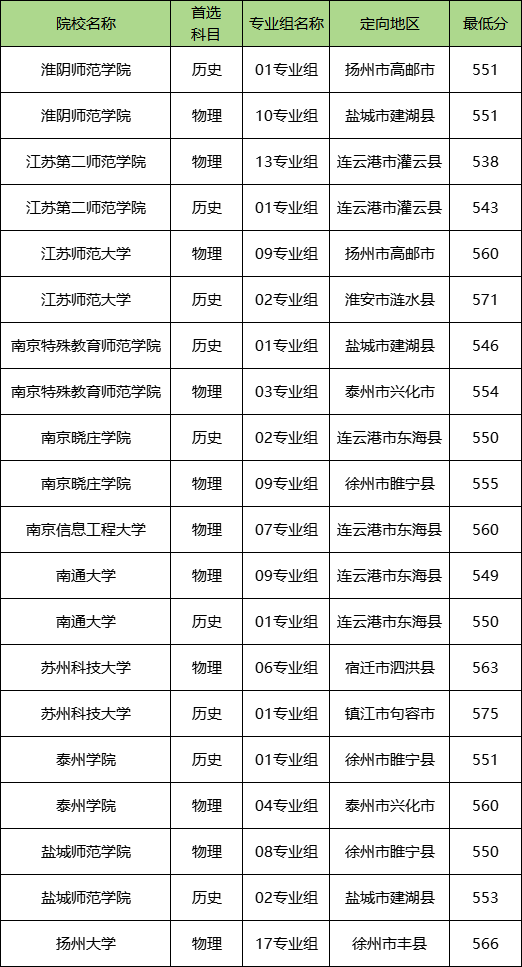 2024年在江苏省具有乡村教师计划招生的院校一共有11所。其中历史类分数线最高的是苏州科技大学01组,最低604分;分数线最低的是江苏第二师范学院01组,最低543分。物理类分数线最高的是南京信息工程大学07组,2024最低分640分;收分最低的是江苏第二师范学院13组,最低分538分。